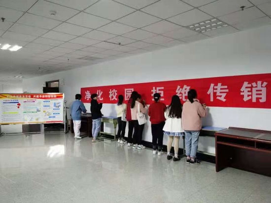 会前,保卫科还向同学们发放了反传销宣传单,提醒学生警惕传销陷阱。随后,同学们在印有“净化校园,拒绝传销”的横幅上签下自己的名字。