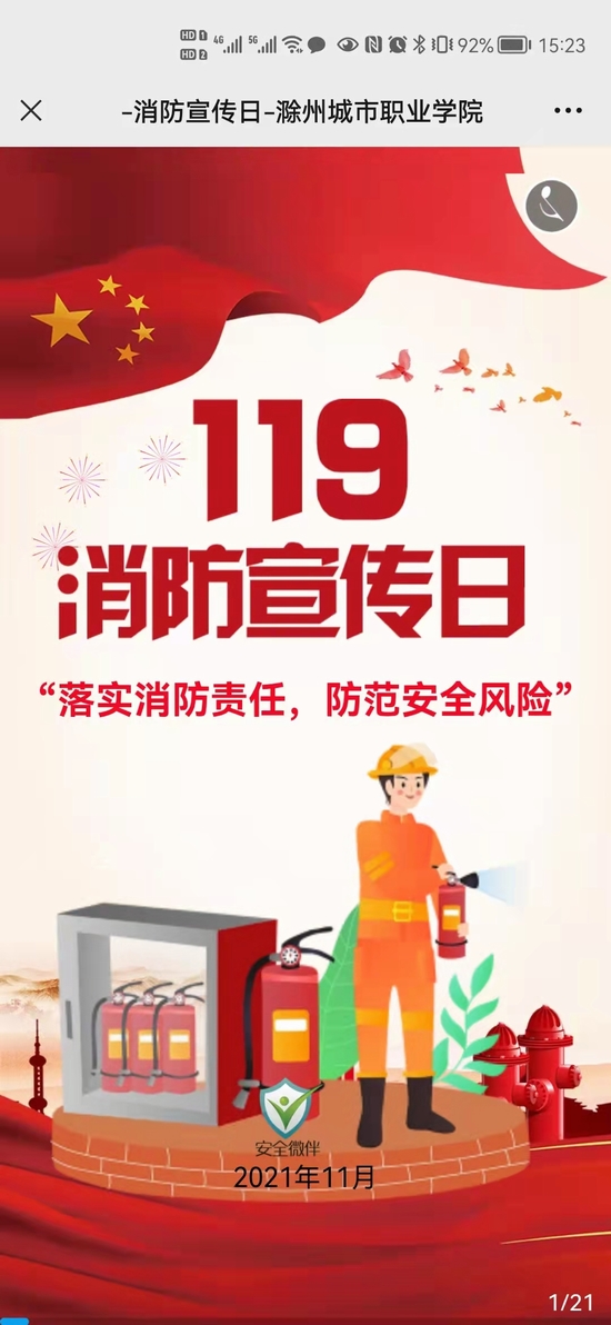 今年11月9日是第30个全国消防宣传教育日。鉴于目前新冠疫情发展形势,为进一步提升全校师生消防安全意识,掌握消防知识,学院保卫科采取线上为主、线下为辅的方式,积极开展消防安全宣传教育活动。