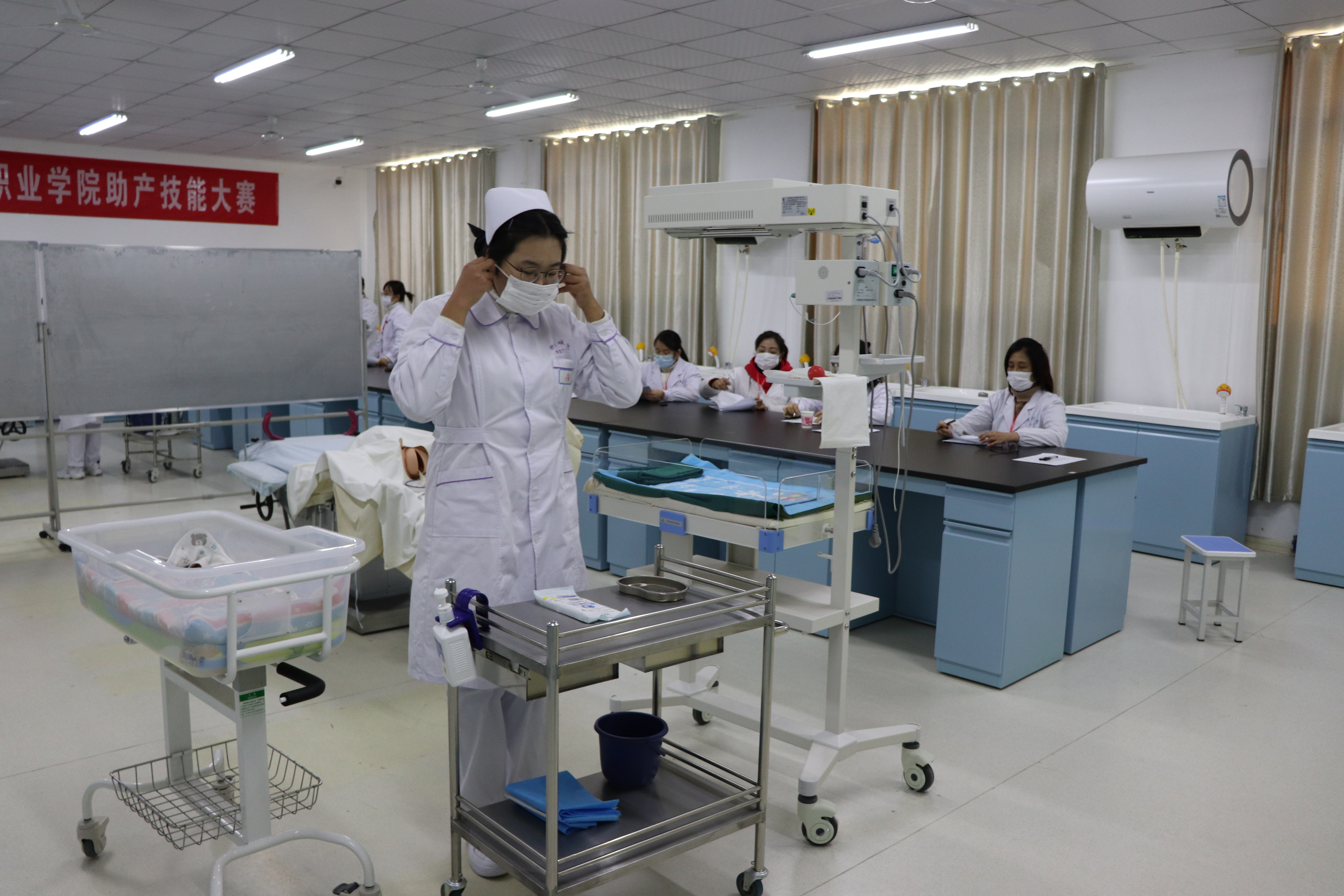 技能大赛是检验职业院校人才培养质量的重要标准,护理系在多年的技能大赛举办和参赛中不断获取经验,已将技能大赛的培训及参赛工作列为每年的重点工作。根据工作安排,护理系于9月开始计划并制定护理、助产、老年健康照护与社会照护三个项目的的技能大赛。本次比赛参照省级技能大赛标准设置统一情境,并增加了标准化病人的使用。护理专业技能大赛决赛要求学生根据病例完成心肺复苏、静脉输液两项操作;助产专业技能大赛要求学生完成产前外阴消毒和产时新生儿护理两项操作;老年健康与社会照护技能大赛要求学生分析病例并完成老年人测量腋下体温、使用轮椅转运老年人两项操作。