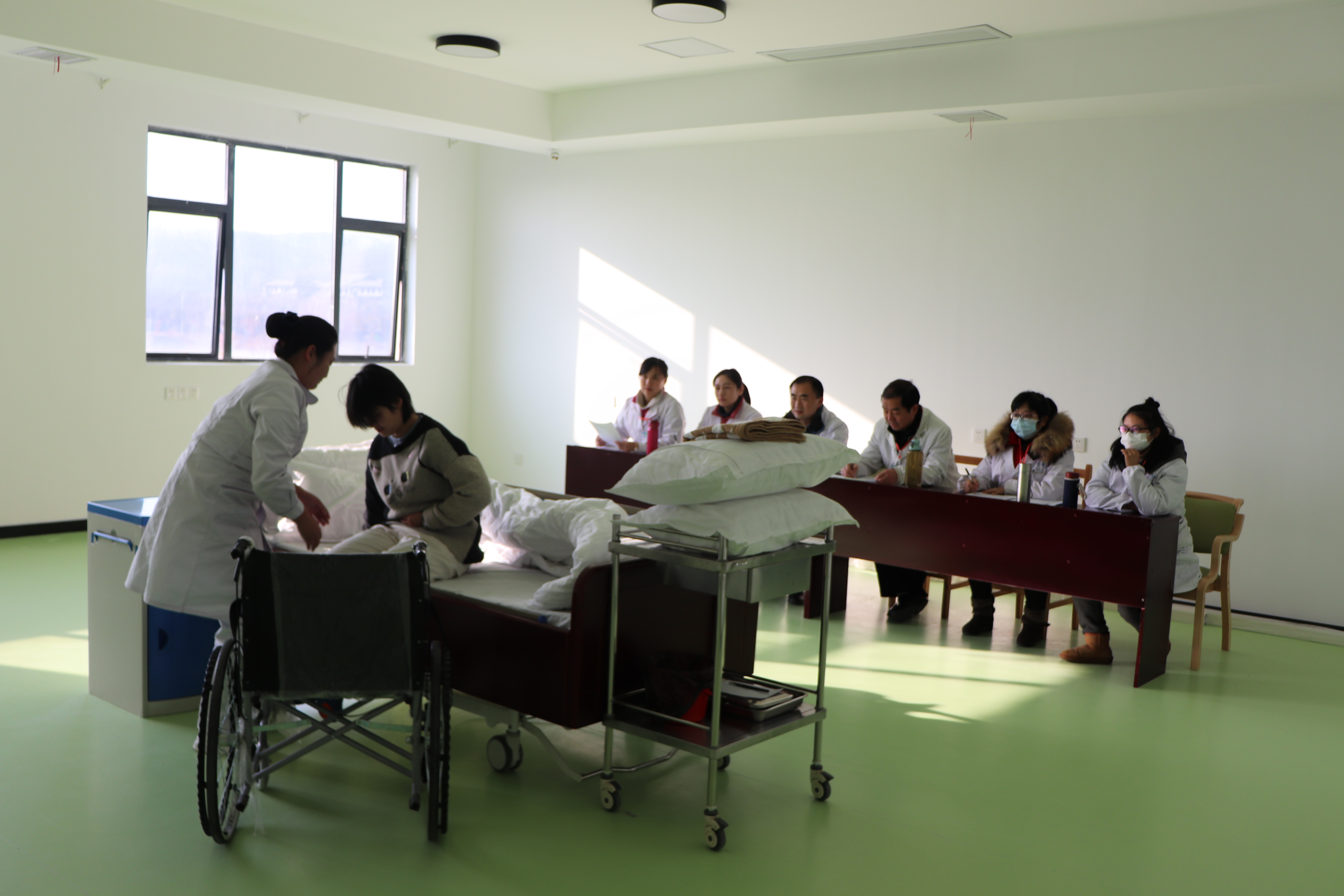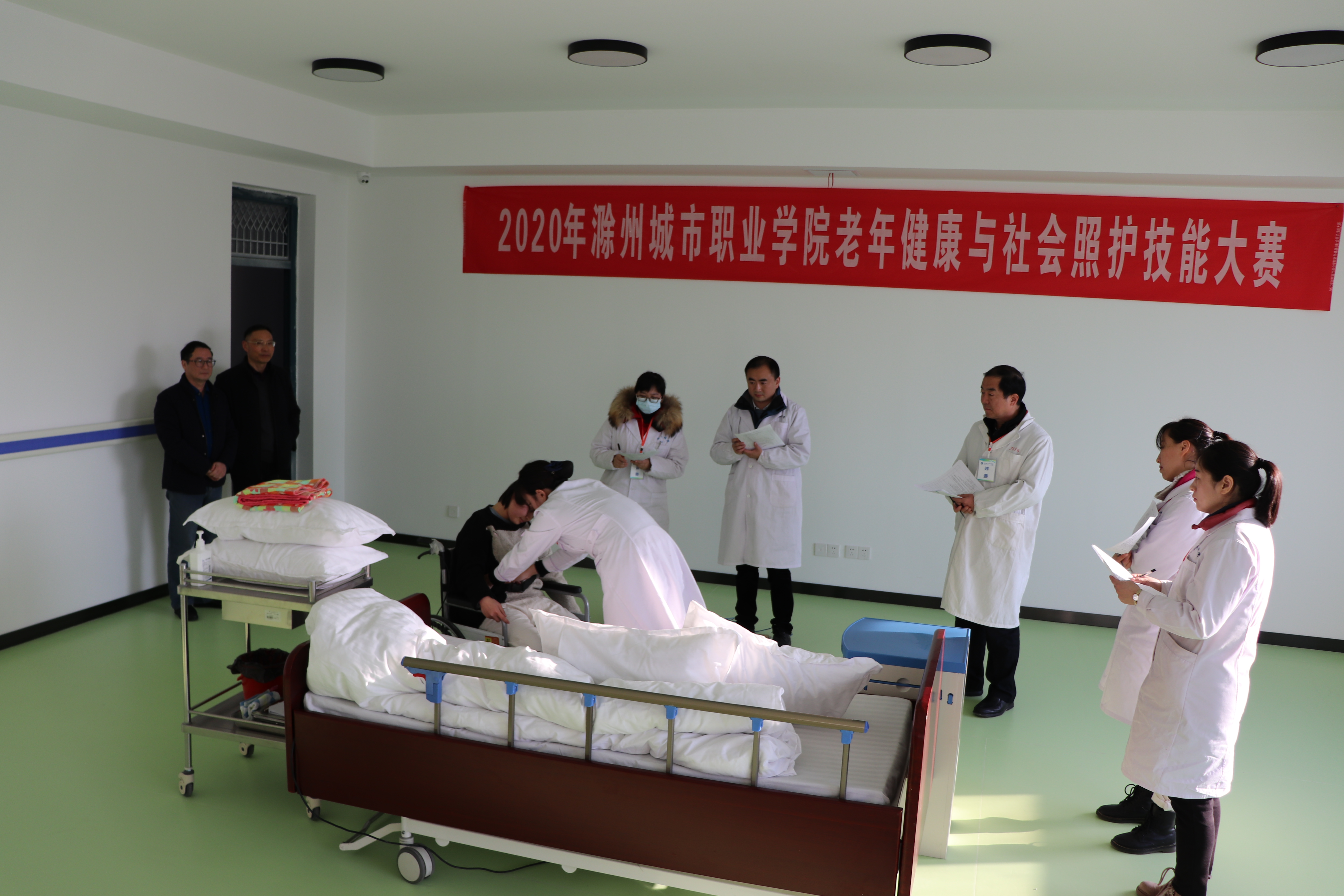 为深化职业教育改革,提高教学质量,展示老年保健与管理学生的应用型实践技能和专业风采,12月16日下午,学院2020年老年健康与社会照护技能大赛在护理系新投入使用的老年护理实训室开赛。党委委员、副院长曹士东,党委委员、教务处处长王树青莅临指导大赛。