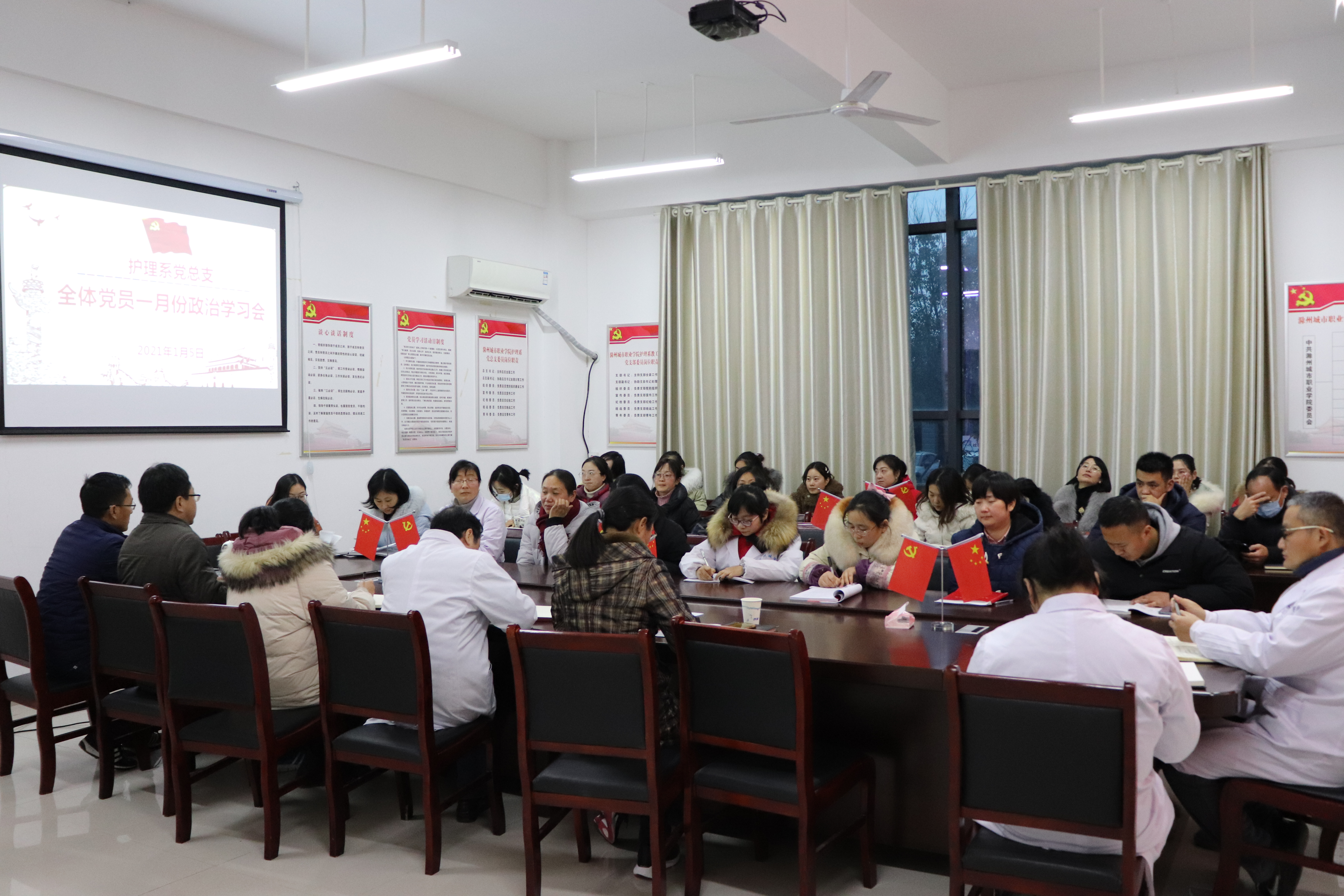 1月5日下午,护理系党总支在B3-106召开党员大会,开展一月份主题党日学习活动。系党总支书记蔡季秋主持会议,系党总支全体党员参加学习。