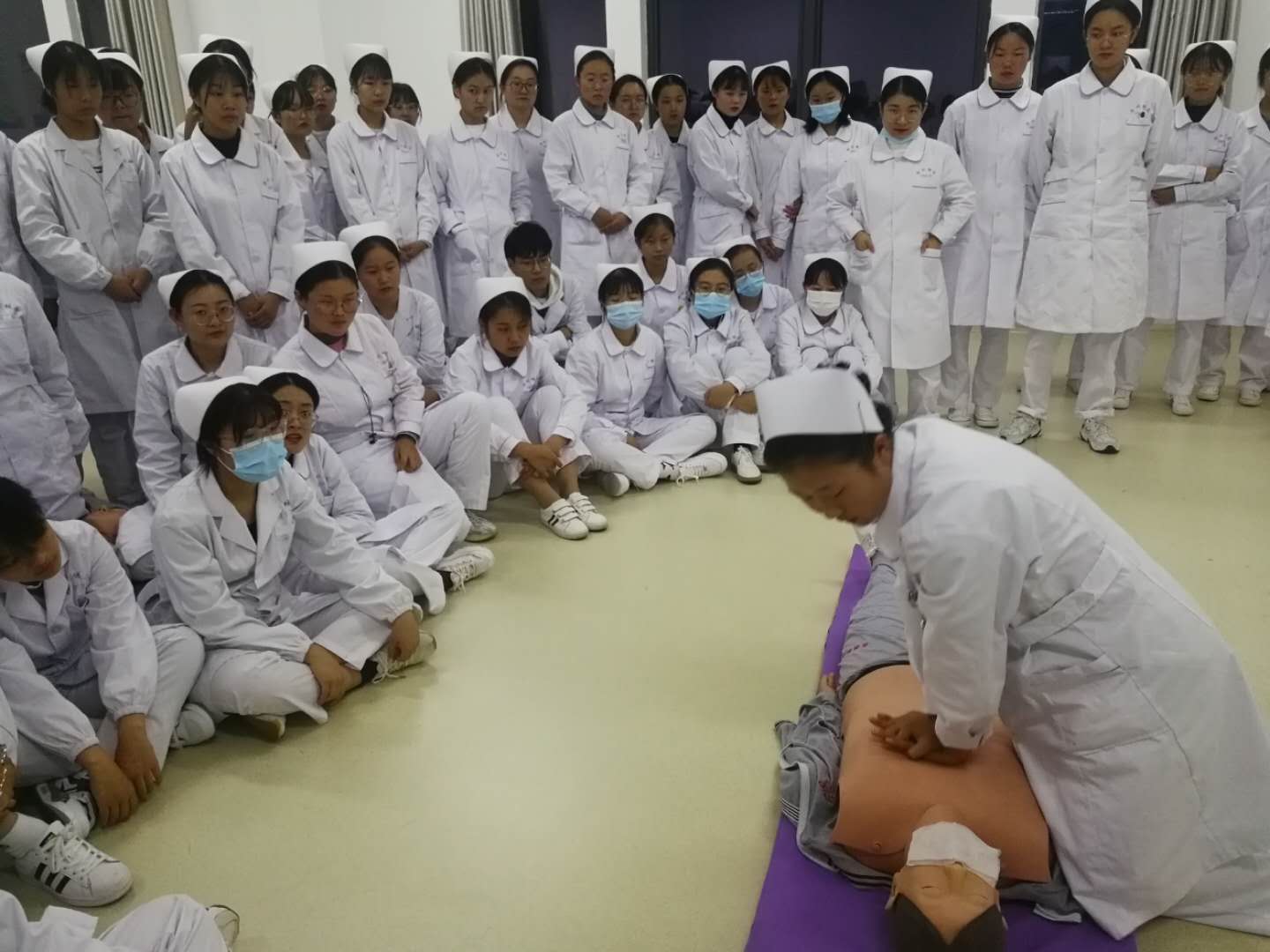 卢老师为学生讲解了心肺复苏、海姆立克急救法的基本技能,并进行了实践操作方面的培训。急救队队长、安徽省护理技能大赛二等奖获得者丁带娣、孙颖为同学做了获奖成果展示。同学们在模拟人上练习心脏复苏操作,大家热情高涨,边听边记,表现出了极大的兴趣。