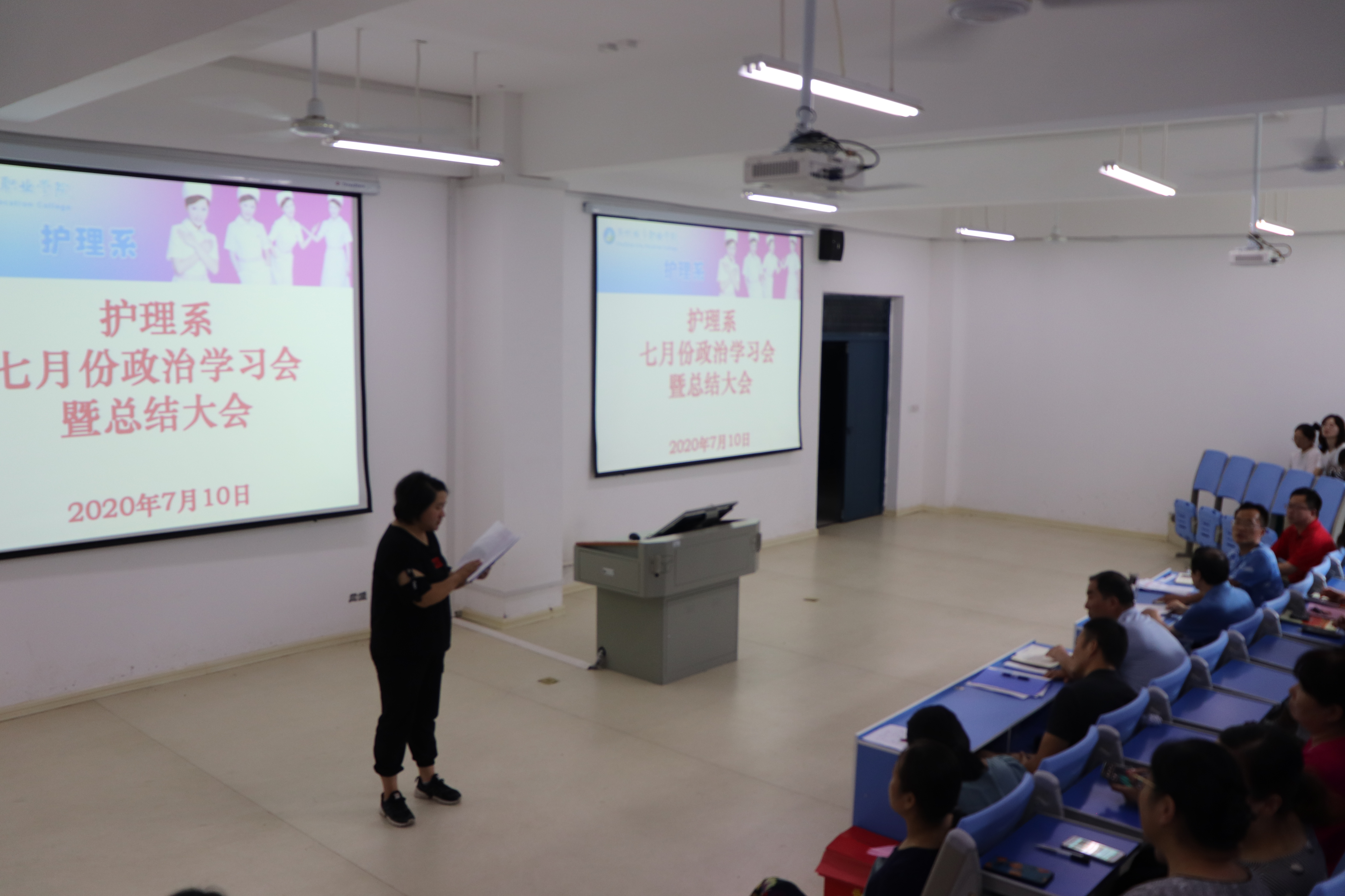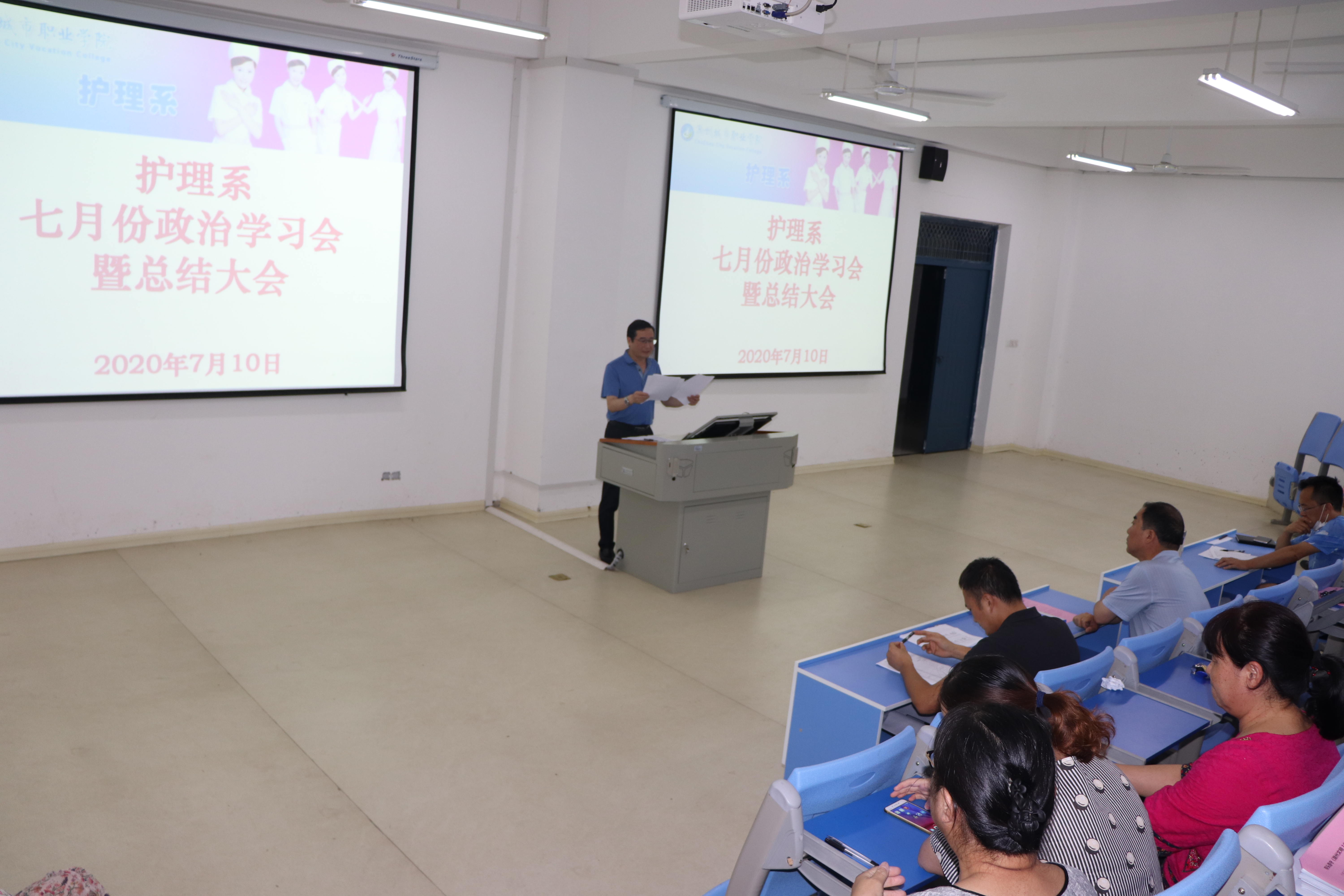 7月10日下午,护理系在B3-110召开七月份政治学习会暨学期工作总结会议,系全体教职工参加了会议,会议由系主任章正福主持。