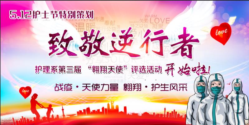 本次“翱翔天使”评选活动是护理系为今年5·12国际护士节和致敬疫情中的逆行者特别推出的纪念活动。经过宣传发动、逐层推荐、审核初评、网上展示点赞、综合评定等评选环节,5月8日,第三届护理系“翱翔天使”评选结果正式揭晓。张文艳、唐晓诺等10名同学分别被授予“勤奋天使”、“才干天使”等10类天使称号,刘意静、陶明鑫等10名同学获“优秀天使”称号。
