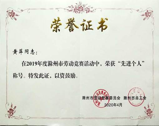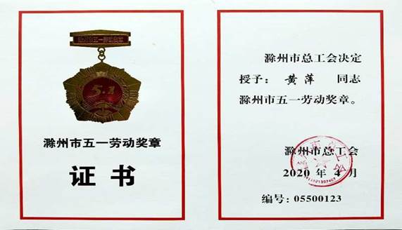 为在全社会大力弘扬劳模精神、劳动精神、工匠精神,滁州市总工会今年“五一”前夕开展了2019年度全市劳动竞赛先进集体和先进个人评选表彰活动,我院黄萍老师敬业爱生,为人师表,锐意进取,勇于创新,技艺精湛,成绩突出,荣获滁州市劳动竞赛“先进个人”称号,并被授予滁州市“五一”劳动奖章。