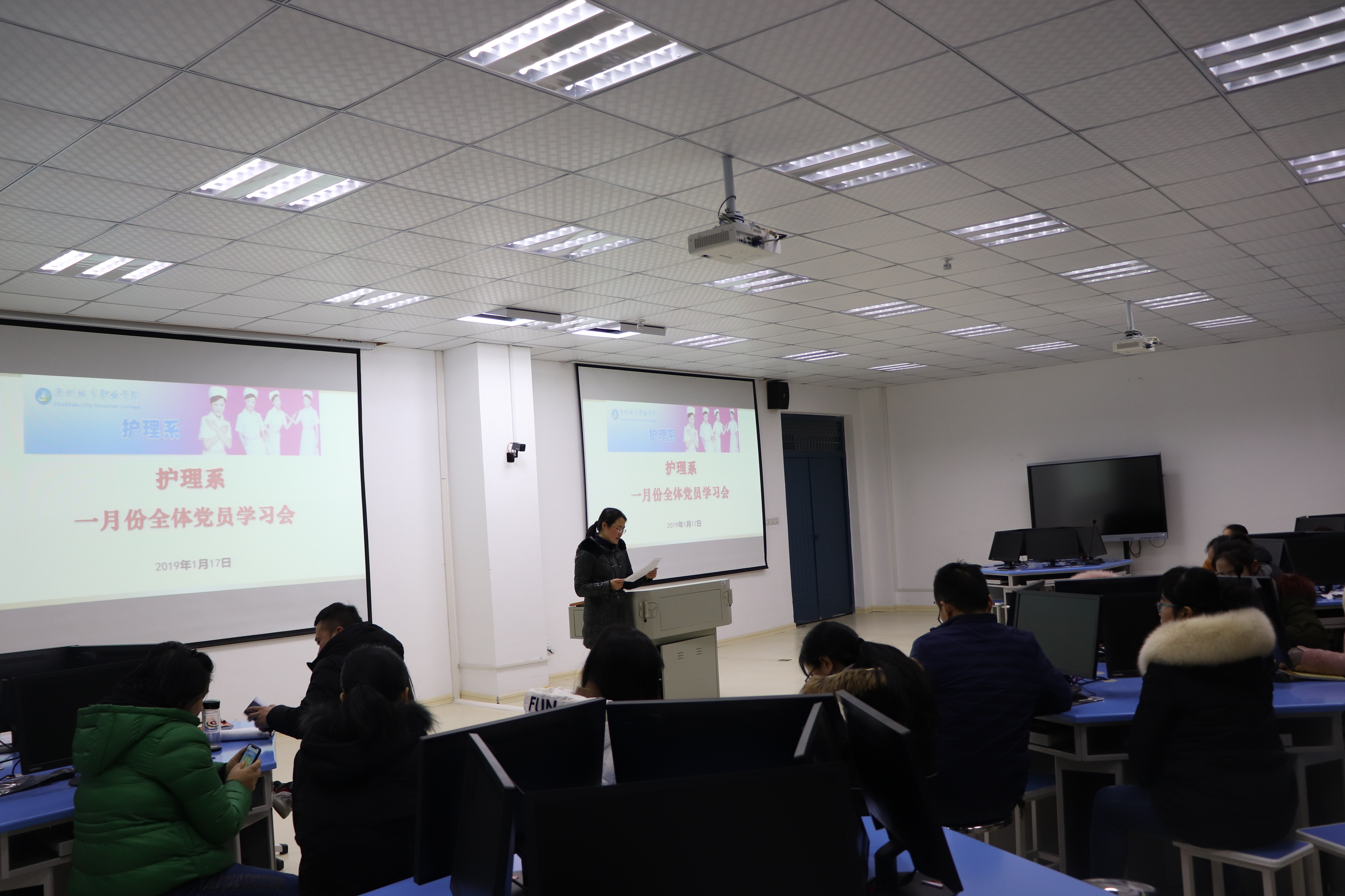 1月17日,护理系党总支在B3-312举行2019年1月份全体教职工政治学习会,系党总支书记蔡季秋主持学习会。