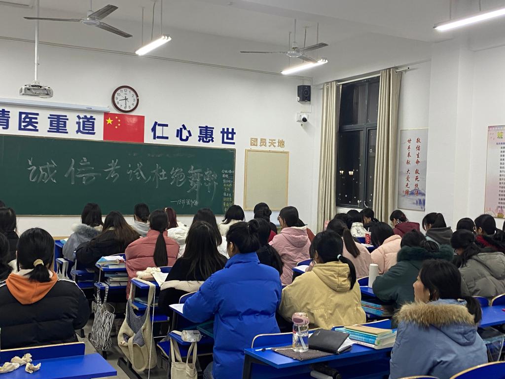 为了迎接即将到来的期末考试,倡导同学们端正考风、严肃考纪、文明答题、诚信应考,护理学院各班在1223日晚上举行了“诚信考试 杜绝舞弊”的主题班会。
