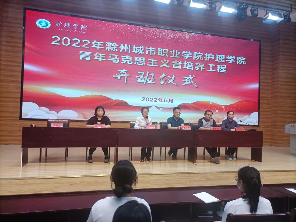 为深入学习贯彻党的十九大和十九届历次全会精神,努力培养一批能力过线、作风过关、思想过硬的团员青年,5月16日,护理学院在第二学术报告厅举行2022年“青马工程”培训班开班仪式。护理学院党总支书记蔡季秋,党总支副书记朱启来,党总支委员、副院长、教工党支部书记左晶晶,党总支委员、组织员、学生党支部书记李勋华,党总支委员、学生党支部副书记卢齐伟,团总支书记王艳及2022年“青马工程”全体学员参加开班仪式。仪式由团总支书记王艳主持。