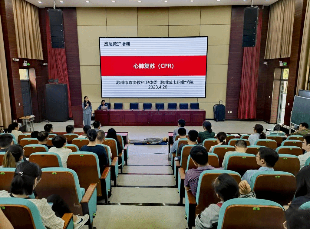 为进一步普及应急救护知识,提高教师应急救护基本技能,在意外伤害发生时能够最大可能性地减少伤害,构建和谐平安的校园,2023年4月20日下午,滁州城市职业学院联合市政协教科卫体委走进滁州二中,对全校74名班主任开展现场应急救护培训。