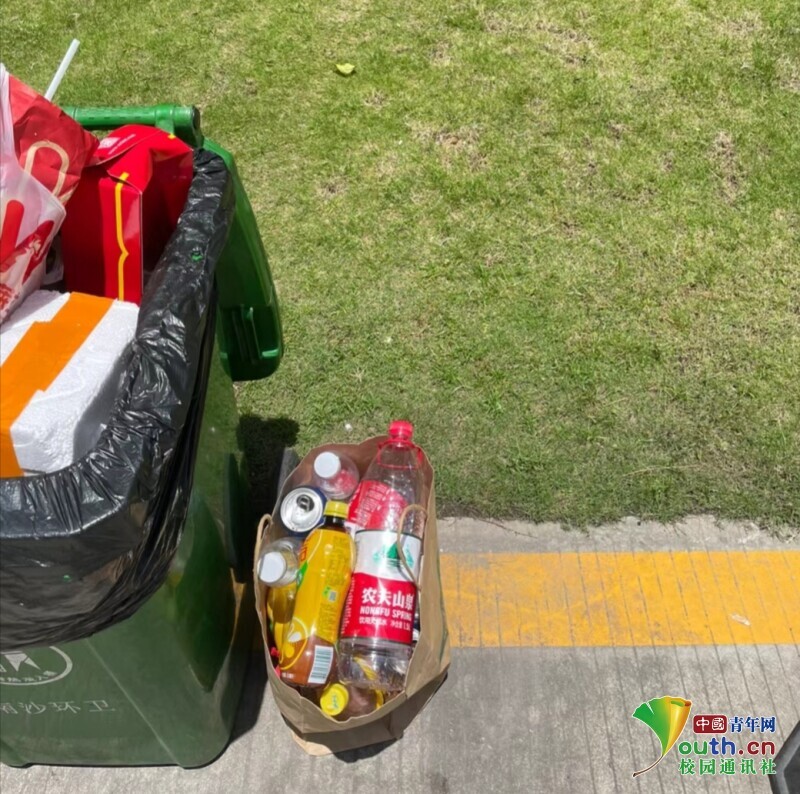 图片为志愿者帮忙捡取塑料垃圾瓶并给予放置垃圾桶里。 中国青年网通讯员 张乐如 摄
