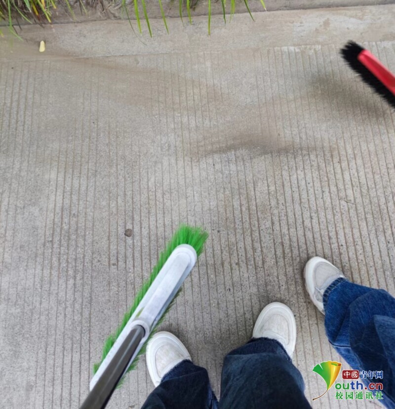 图片为志愿者们在街道上打扫地面的卫生。中国青年网通讯员 张乐如 摄