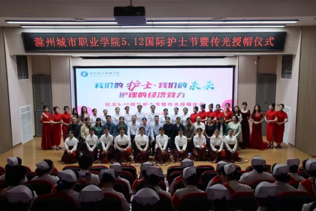 我们的护士,我们的未来。为庆祝第113个5.12国际护士节,弘扬南丁格尔精神,增强护生的职业荣誉感,激励护生传承护理精神。5月9日,滁州城市职业学院在图文中心报告厅举办5.12国际护士节活动暨传光授帽仪式活动。校党委副书记、校长汪上,校党委副书记牛春雨,校党委委员、副校长曹士东,校党委委员、副校长吴惠珍,校党委委员、纪委书记池鹏,校党委委员、办公室主任、宣传统战部部长陈通,教务处处长戴锦明,团委书记陈婷婷,院长金虹,以及杰出校友凤阳县人民医院党委书记徐娜,滁州市第二人民医院护理部主任薛庆静等莅临现场。仪式由护理学院党总支书记蔡季秋主持,师生代表近400人参加活动。