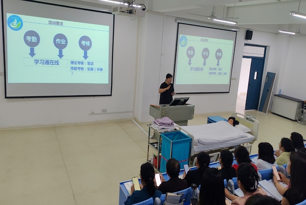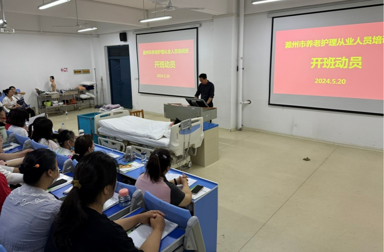 为进一步提升全市养老服务护理人员综合素质,满足老年人多样化、专业化养老服务需求,打造一支德技兼备的养老服务人才队伍。由滁州市民政局、滁州市人力资源和社会保障局主办、滁州城市职业学院承办的2024年度全市养老服务护理员培训班,于2024年5月20日在我校护理学院举办了开班仪式。民政局养老服务科科长钱尼兵做了开班动员报告,护理学院副院长左晶晶强调了培训班的学习和纪律要求。