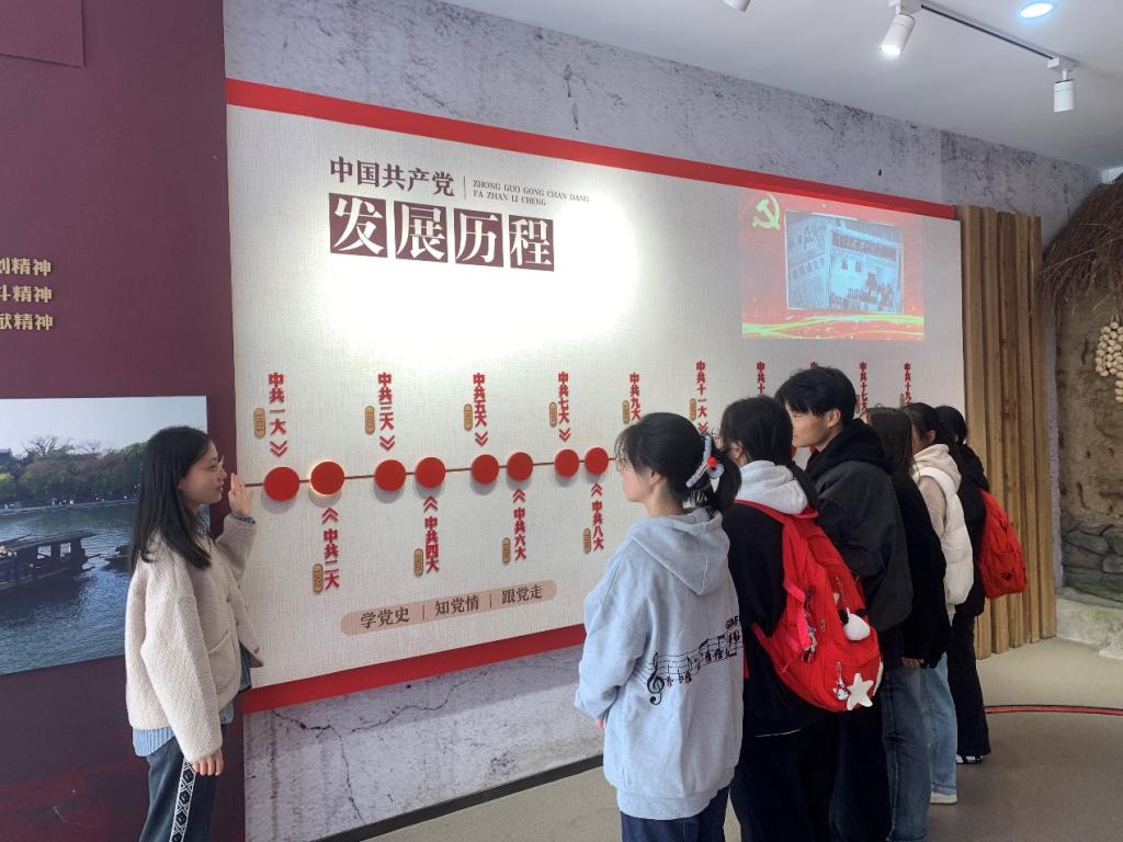 在施集镇党性教育馆,护理学院学生党支部宣传委员周家静现场化身讲解员,为参与活动的入党积极分子深入讲解峥嵘党史。入党积极分子们在了解抗日战争、解放战争时期施集镇的革命英烈、新时代乡贤的感人事迹后,更加坚定永远跟党走的信心和决心。