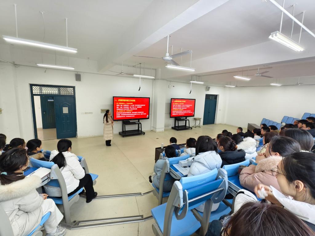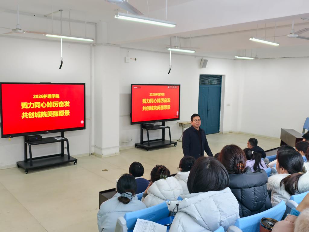 为全面总结2025年度工作成效,科学谋划2026年发展蓝图,凝聚全院教职工奋进力量,近日,滁州城市职业学院护理学院在学校阶梯教室召开期末教职工大会。护理学院院长金虹、党总支书记席民出席会议,全院教职工参加会议。