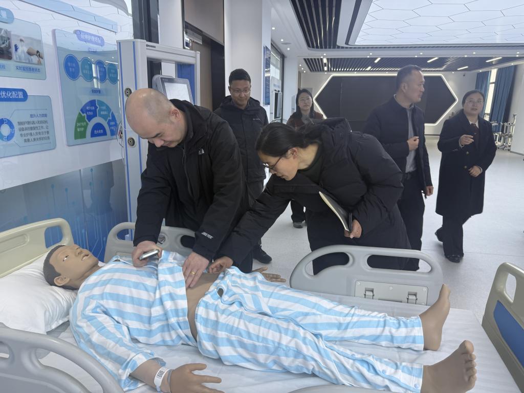 座谈结束后,滁州学院教师一行实地参观了护理学院智慧护理实训中心。在实训现场,周方方、王京等专任教师结合实训设备,详细演示了智能护理模拟人操作、虚拟仿真急救训练等实训项目,展示了学院在临床护理、急救技能、健康管理等方向的实训教学特色。滁州学院教师代表现场观摩了心肺复苏、腹部查体等实训教学环节,亲身感受了智慧化实训教学的创新模式,对学院先进的实训设施、规范的教学流程给予高度评价。