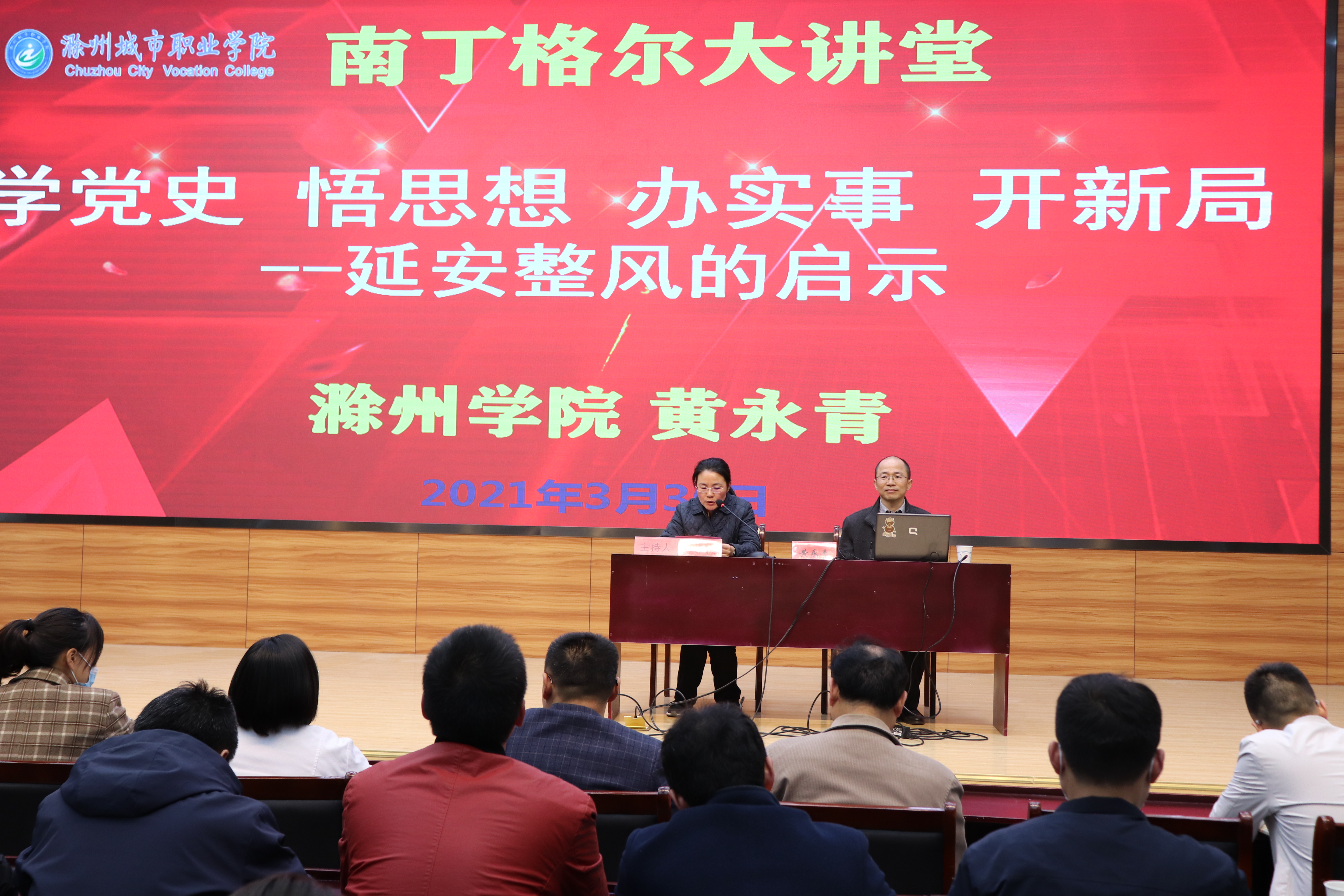 黄永青以“学党史 悟思想 办实事 开新局--延安整风的启示”为题,从延安整风的特定背景、主要过程,延安整风中党的作风转变的具体体现,对延安整风精神进行了解读和诠释。黄书记用形象的语言和大量的历史文献,从历史和现实、理论和实际相结合的角度,从为什么要进行延安整风、延安整风的深远影响和现实启迪等方面进行了深入的宣讲。报告主题鲜明、内容丰富、史料翔实、思想深刻,使大家深受教育、深受启发,对于我们深刻理解党的群众路线、发扬党的优良传统和作风,更好地开展党史学习教育具有指导意义。黄永青,现任滁州学院材料与化学工程学院党委书记、校纪律检查委员会委员。1994年6月毕业于阜阳师范学院思想政治教育专业,2000年获中国人民大学法学硕士学位,长期从事《社会学》《思想道德修养与法律基础》《中国近现代史纲要》等课程的教学与研究。