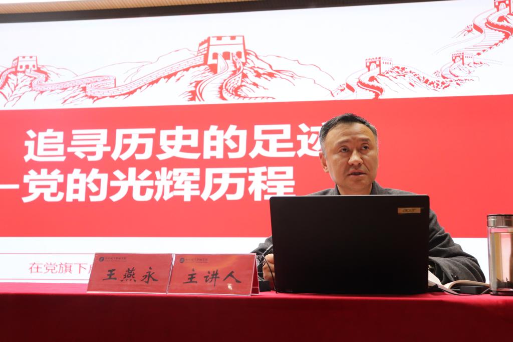 王燕永首先从改天换地变新颜、在摸索建设中前进、走向希望的田野、迈向中国式现代化道路四个方面带领全体参会人员回顾了峥嵘党史。随后,引用意大利哲学家克罗齐、中国文学巨匠鲁迅、美国前国务卿基辛格的名言,详细为大家论述为什么中国共产党史是一部革命史、一部求生史、一部创新史。最后,以习近平总书记庆祝中国共产党成立100周年大会上的讲话中对青年的寄语,表达对本次参会的新教师、入党积极分子的殷切希望,号召大家担当历史使命,努力做到主动担当作为,以更加昂扬的精神状态和奋斗姿态,履行好自身使命。
