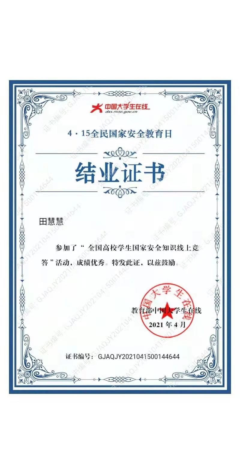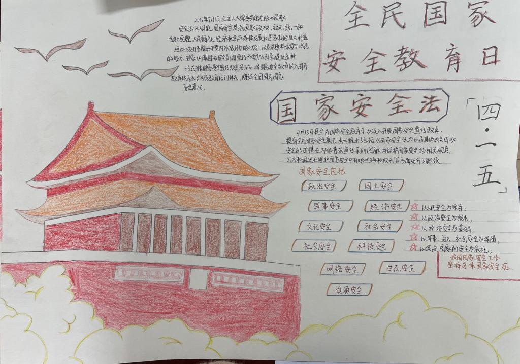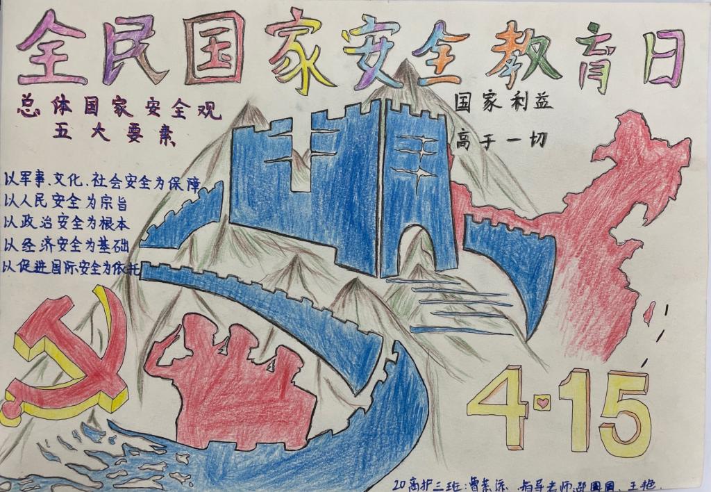 42个班级1800余名同学通过多种形式参加活动。线上,同学们积极参与国家安全知识竞答,获得由教育部中国大学生在线颁发的学习证书。线下,各班召开主题班会,学习国家安全日的相关知识,集体观看央视综合频道播放的《护航之道—总体国家安全观纵横》专题宣传片,同学们纷纷分享和讨论观看心得和感想。曹恭添、管誉微同学更是用纸和笔制作出属于他们的手抄报,宣传了国家安全观念,使维护国家安全,你我有责的意识深入人心。另外,各班级同学还通过微信、微博等对国家安全日进行了广泛宣传,使国家安全的相关知识被更多人所知,共同维护国家的安全。