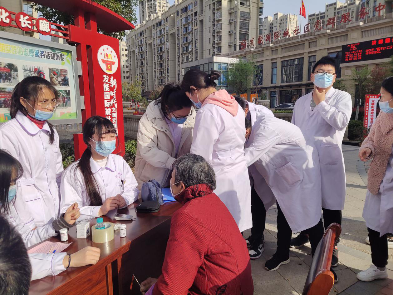 19护理高专9班在杜曼周霞老师带领下前往发能国际城社区开展医疗保健知识宣传卫生服务等志愿活动为老人量血压测脉搏宣教慢性病9学生为社区居民发放慢性疾病预防办法宣传单热情解答相关问题得到了社区居民的一致好评
