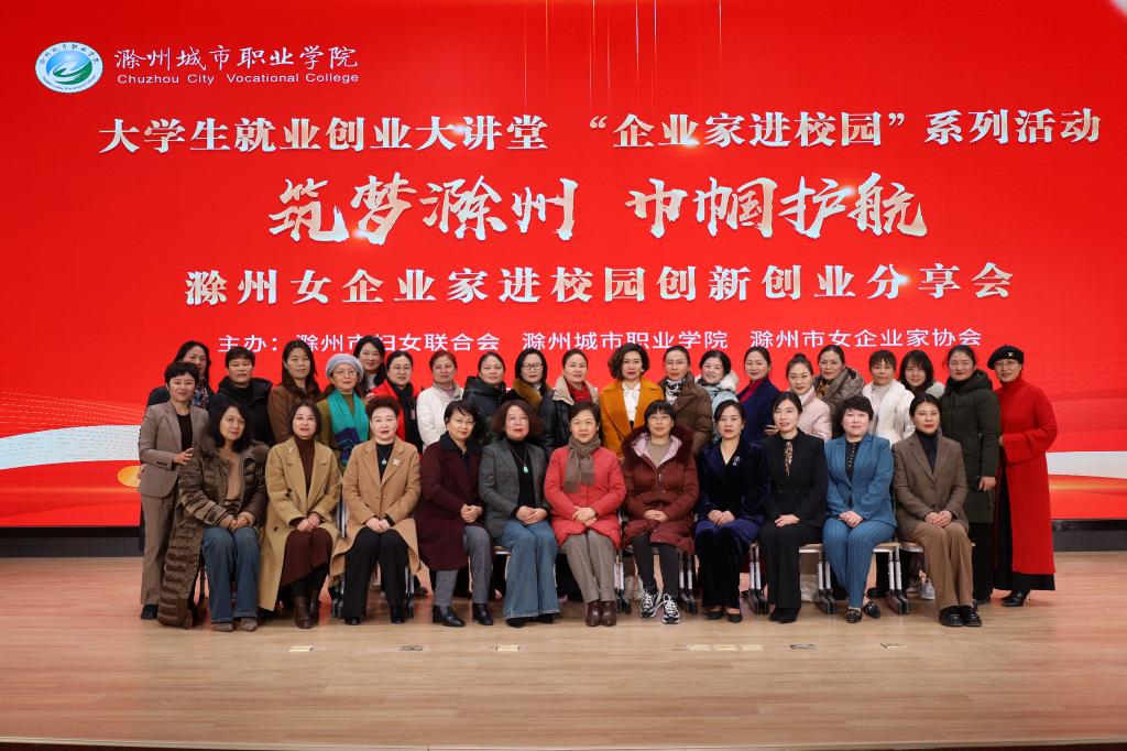为更好助推学生就业创业,促进学生成长成才,充分发挥女企业家在引领女性创业、助力人才培养上的独特优势,12月16日,学校联合滁州市妇女联合会、滁州市女企业家协会开展“筑梦滁州 巾帼护航”女企业家进校园系列活动,邀请滁州市成功创业家和企业家送就业岗位进校,并为大学生开展创新创业分享。校党委书记张志华出席活动并讲话。党委委员施向阳参加活动并致辞。滁州市妇女联合会党组书记、主席周爱勤,副主席吴晓丽和滁州市女企业家协会近30名会员女企业家参加活动。招生就业处处长朱启来主持分享会,近300名在校大学生聆听了事迹分享。