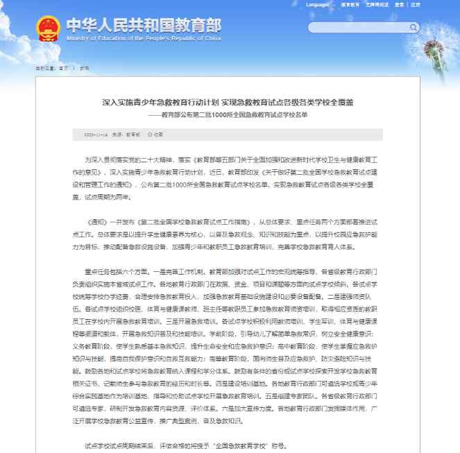 近日,教育部印发《关于做好第二批全国学校急救教育试点建设和管理工作的通知》(教体艺厅函〔2023〕30号)。我校经自主申报、省级教育行政部门审核推荐、教育部综合认定并公示,成功获批为第二批全国急救教育试点学校。热烈祝贺!