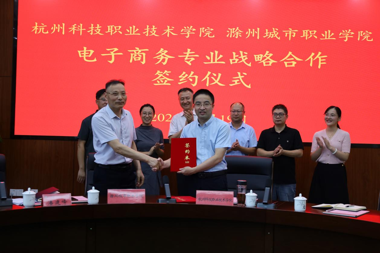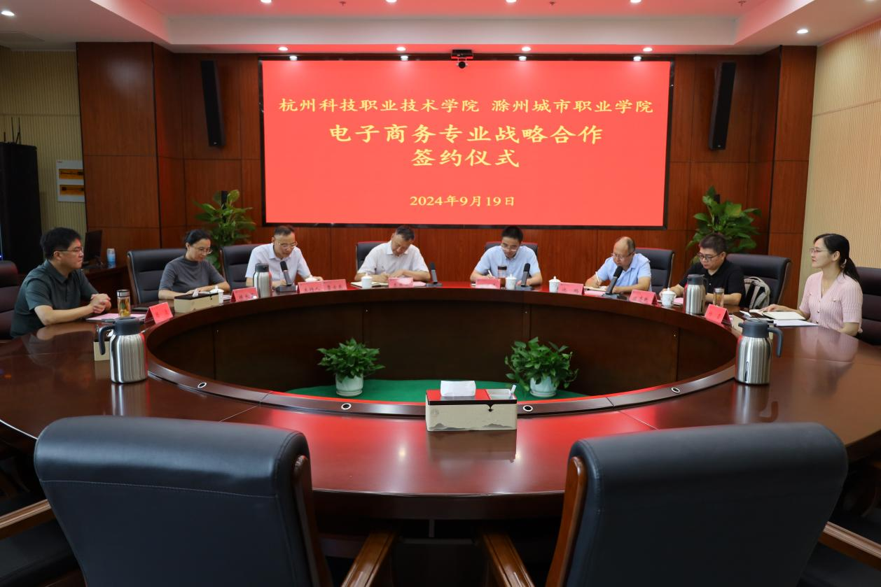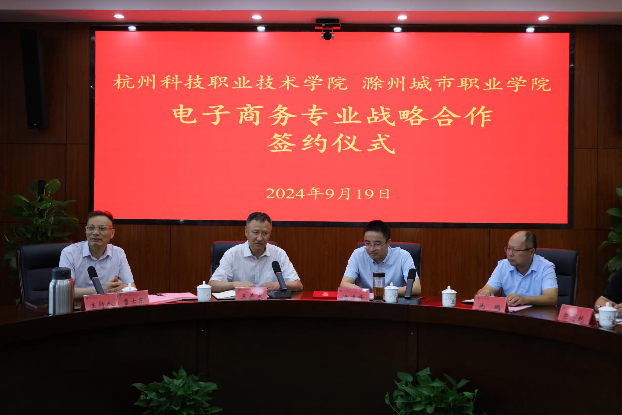 为提升专业发展质量,优化人才培养模式,9月19日上午,我校与杭州科技职业技术学院举办了校校合作签约仪式。校党委书记王燕永出席签约仪式并讲话。校领导池鹏、陈通、杨莹等出席仪式,杭州科技职业技术学院副校长潘建峰、商务管理学院副院长陈长英、电子商务专业负责人陈志乾参加仪式。仪式由党委委员、副校长曹士东主持。