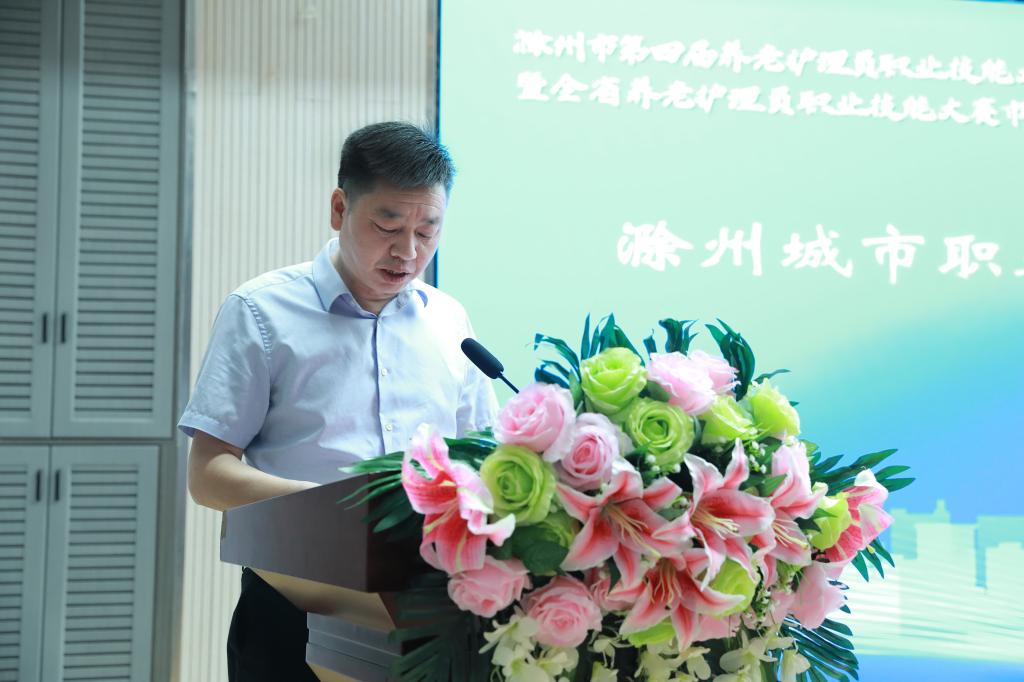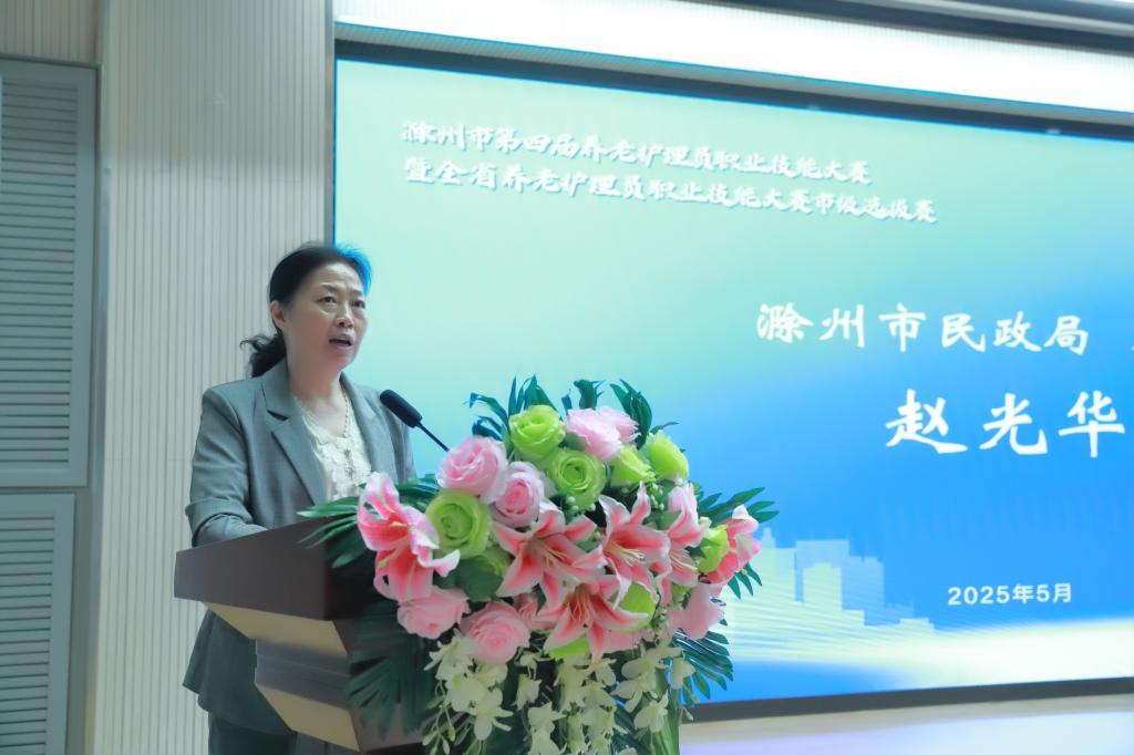 市民政局党委书记、局长赵光华在讲话时指出,养老护理员是养老服务高质量发展的核心力量,承载着守护“夕阳红”的重要使命。一直以来,我市紧扣“人才强基”战略,以培训提能、竞赛练兵、政策激励为抓手,推动养老服务队伍专业化、年轻化、规范化发展。养老服务是“国之大者”,亦是“民之盼者”。她希望以大赛为新起点,携手构建“老有颐养”幸福标杆,为全省乃至全国提供“滁州方案”。