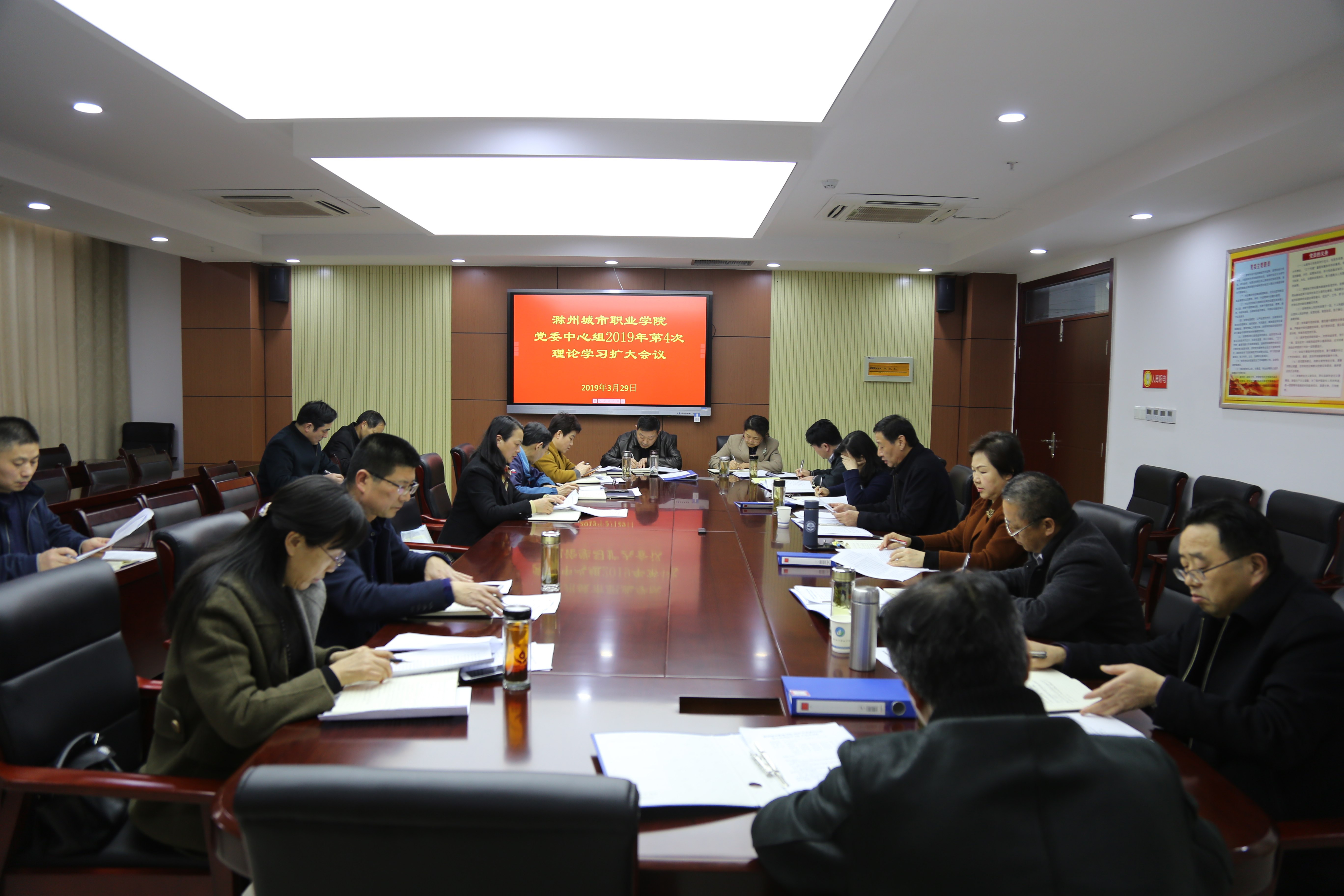 3月29日下午,在图文中心第四会议室,党委书记米德成主持召开学院党委中心组2019年第4次理论学习扩大会议,学院党政领导班子成员、副处级领导干部参加会议。