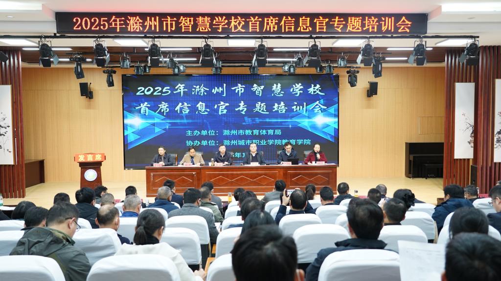 为深入贯彻落实国家教育数字化战略行动部署,加快推进滁州市智慧教育建设,12月1日,由滁州市教育体育局主办、教育学院承办的2025年滁州市智慧学校首席信息官专题培训会在教育学院报告厅顺利开班。校党委副书记、校长汪上出席开班式并致辞,市委教体工委委员、市教体局副局长都兰·沙格尼西出席并作培训动员讲话,来自全市各县(市、区)的中小学校长、首席信息官等教育信息化骨干,我校各二级学院相关负责人参加本次培训。