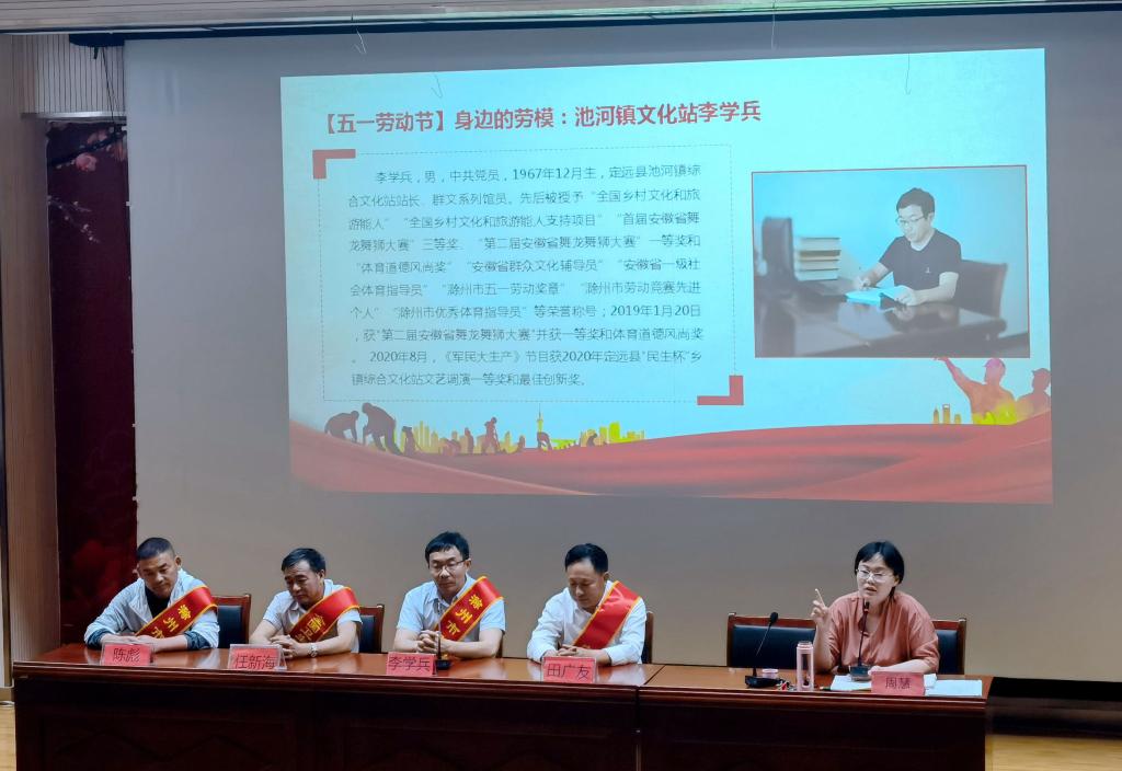“滁州市五一奖章”获得者李学兵同志是定远县池河镇综合文化站站长。李学兵同志潜心基层文化和旅游工作31年,成立文化协会,将本地消失40年的舞龙队重新组建起来,并打造特色文化品牌,李学兵同志所编排的舞龙节目《二龙戏珠》在第二届安徽省舞龙舞狮大赛中荣获一等奖和体育道德风尚奖,并于2020年5月15日录入《中国影像方志》第541集《安徽定远篇》,由中央电视台CCTV-10套播放。舞龙队在李学兵同志的带领下队伍不断壮大,现已是“定远县非物质文化遗产传习基地”、“二龙戏珠”示范传习基地。李学兵同志先后荣获“全国乡村文化和旅游能人”、“安徽省群众文化辅导员”、“安徽省一级社会体育指导员”、“滁州市五一劳动奖章”等多项荣誉称号。