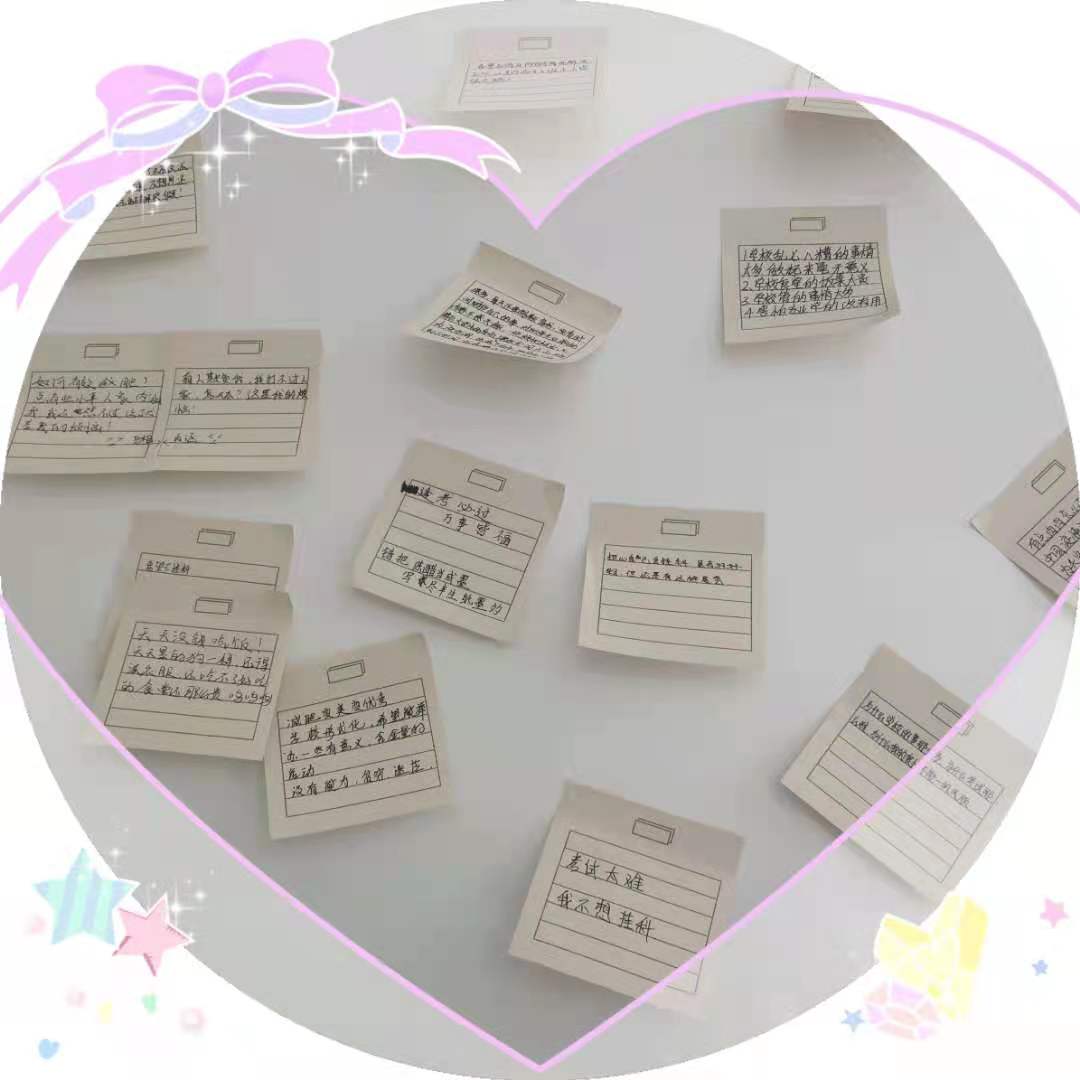 心语便利贴活动。学生们在医学系青年之家的心情墙上贴上了自己的心情便利贴,有的写下对老师、朋友、同学和自己的祝福,有的写下给未来的自己的话,还有的写下了遇到的烦恼,大家通过在便利贴上匿名书写的方式将自己内心的焦虑、紧张等负性情绪释放出来,缓解学习、生活等压力,进而达到心理调适的目的。
