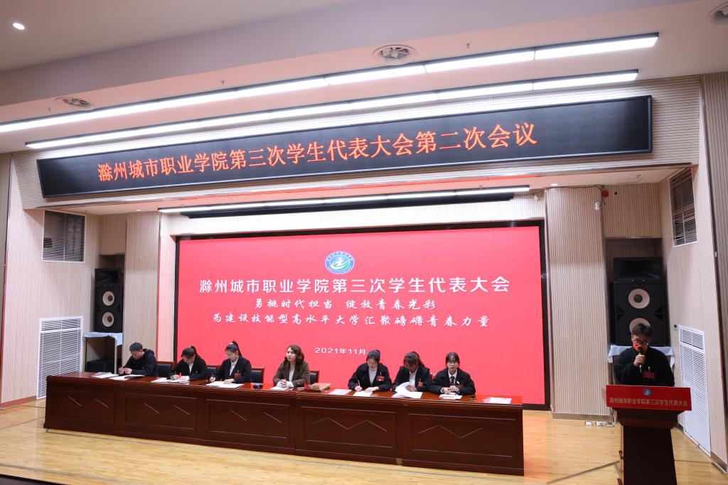 晚上19时,大会第二次全体会议召开。会上表决通过了《关于滁州城市职业学院学生会工作报告的决议》、《第三次学生代表大会选举办法(草案)》,审议通过了《大会总监票员、监票员、总计票员、计票员名单(草案),选举产生了学院第三届学生会主席团及第三届学生委员会。
