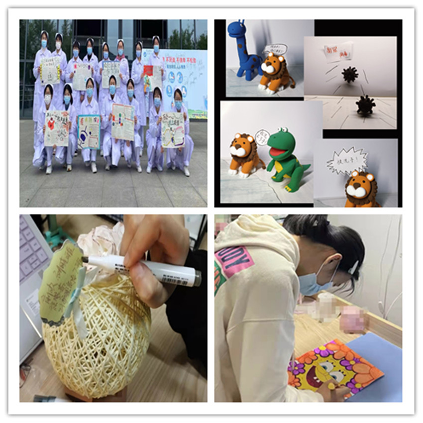 做解压疏导的“贴心人”。为贯彻落实校党委有关疫情防控期间工作的相关要求,做到疫情防控与文体活动协同推进,为鼓舞广大青年学生抗“疫”斗志,坚定抗“疫”信心,弘扬伟大抗疫精神,缓解学生焦虑情绪,丰富疫情防控封校期间课余文化生活。护理学院组织各班级、各寝室按照防疫要求小范围寝室为单位,广泛开展同心击鼓、珠行万里、纵横天下、穿针引线、脚夹球跳接力赛、抛绣球等趣味游戏活动。还组织开展广场嗨歌、广场集体跳舞、抗疫手工、清明网上祭扫,也组织拍摄小视频、绘画手抄报展示等丰富多彩的文化体育活动。在封校工作期间,组织开展趣味游戏、运动和文化活动近200场次,受益人数近3000人次。趣味游戏和文化活动有效缓解了疫情防控封校期间的心理压力,丰富了同学们的课余文化生活和养成健康的生活方式,为持续做好疫情防控常态化下学生心理疏导提供了有益探索。