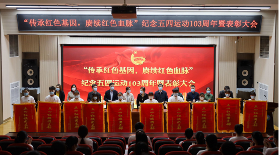会议在雄壮的国歌中拉开序幕。陈婷婷宣读2021 年度“五四红旗团支部”、 “五四好青年”、“最美志愿者”表彰名单。与会领导为受表彰学生代表颁奖。