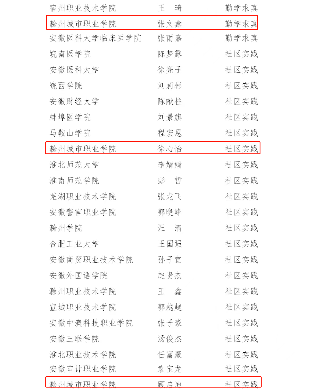 根据《2021年度“安徽省大学生自强之星”奖学金推报评选工作指引》,按照爱国修德、勤学求真、创新创业、社区实践、奋斗力行5个类别,经组委会组织专家评审,共计确定100名同学(含全日制本、专科生和研究生)为“安徽省大学生自强之星”获得者,10位同学为“安徽省大学生自强之星标兵”获得者,并择优推荐70名同学为“中国大学生自强之星”奖学金候选人,我校学子张文鑫、徐心怡、顾启迪3名同学荣获“安徽省大学生自强之星”,徐心怡同学被推荐为“中国大学生自强之星”奖学金候选人。