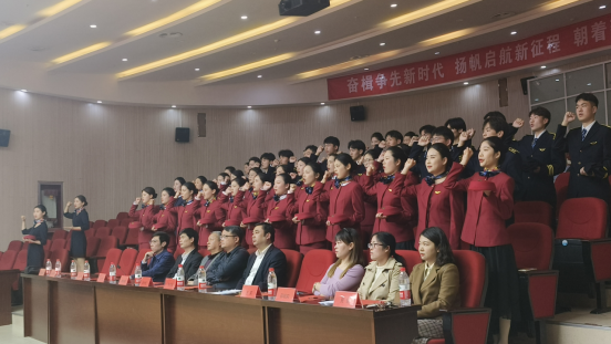 同学们整装肃立,高举右手宣誓:“我是滁州城市职业学院空中乘务专业的学生,是未来从事航空服务事业的工作人员,遵守滁州城市职业学院校规,遵守空中乘务专业行为规范,履行学生的职责和义务,心存敬畏,满怀感激,坚定航空服务工作信念,牢记我是民航人,践行民航精神,认真学习,严谨锤炼,时刻准备着,为民航事业贡献自己的智慧与力量。无愧于学校!无愧于民航事业!无愧青春!”