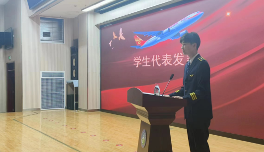 张旭代表学生发言,他表示同学们将以饱满的热情、科学的方法和积极的态度投身到学习中去,以昂扬的斗志、坚韧的毅力和充足的准备去迎接每一次挑战,学好专业文化知识和专业技能,为早日实现航空梦而不断努力着。未来,空中乘务班的学子们也会始终以民航人的标准要求自己,用民航人的行为规范约束自己,做到爱岗敬业、不忘初心,为未来民航事业的发展贡献自己的智慧与力量。