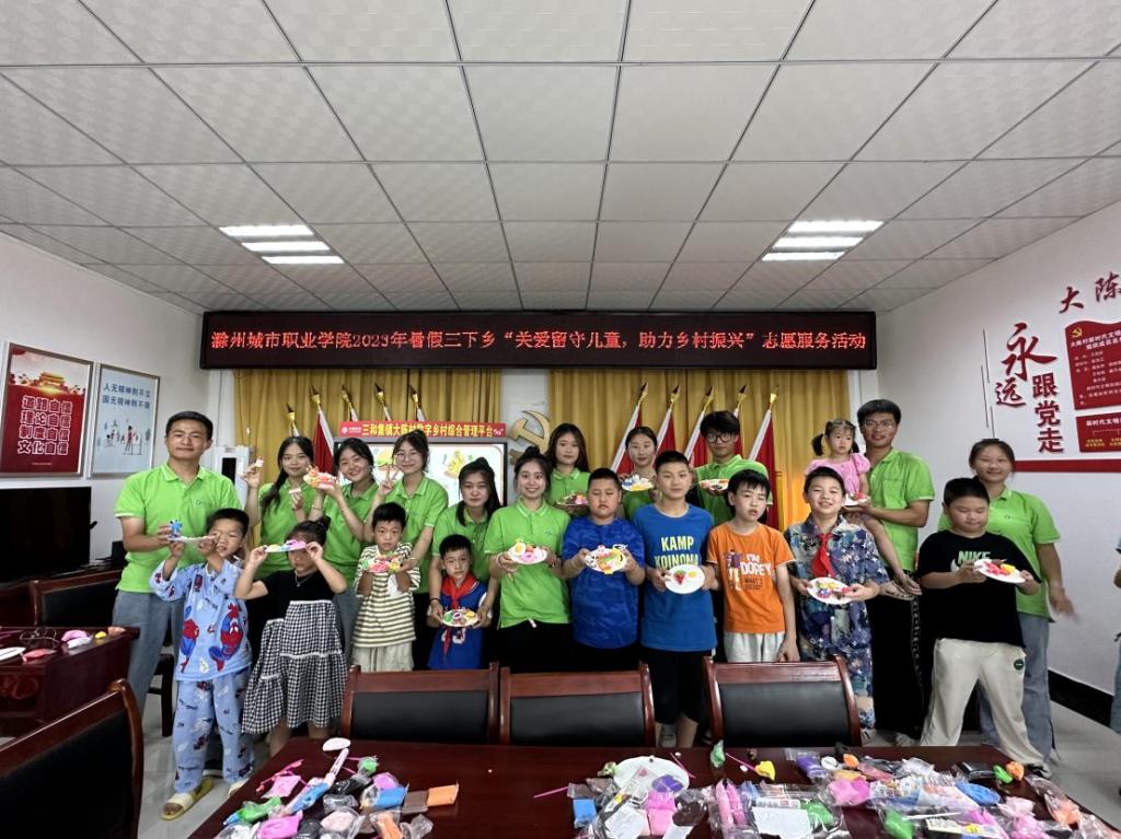 图为教育学院暑期社会实践团成员与小朋友们展示手工成果
