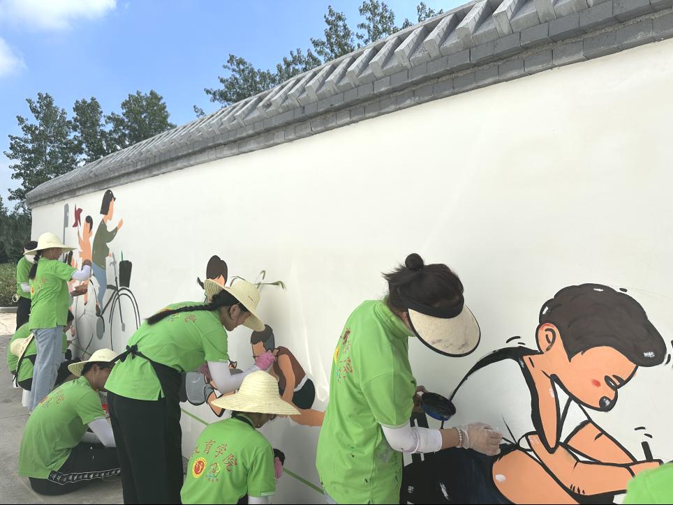 图为教育学院暑期社会实践团在炎热的天气下为美丽乡村墙绘