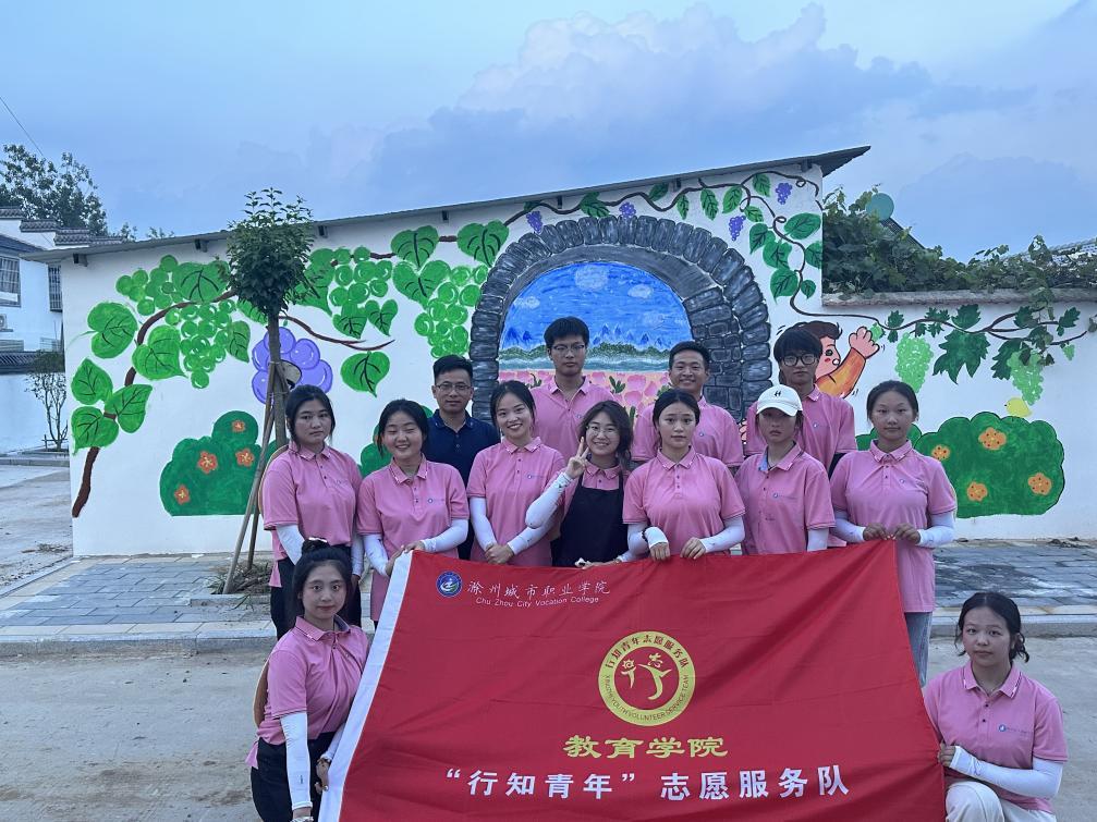 图为教育学院暑期社会实践团成员在绘制好的墙绘前合影