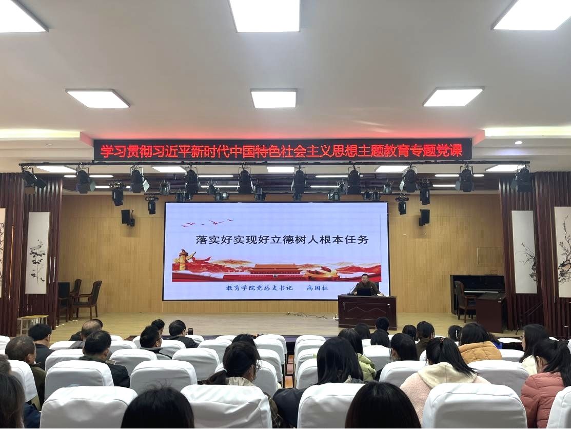 为认真学习贯彻习近平新时代中国特色社会主义思想主题教育,增强对党的创新理论的政治认同、思想认同、情感认同,以学铸魂、以学增智、以学正风、以学促干,11月15日,教育学院党总支书记高国柱结合理论学习,联系个人思想和工作实际,以《落实好实现好立德树人根本任务》为题讲授专题党课,教育学院全体教职工参加党课学习。