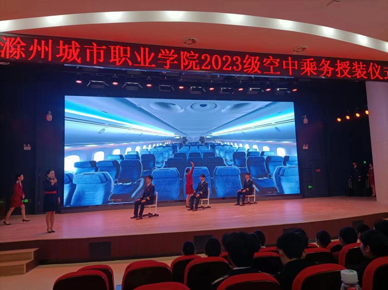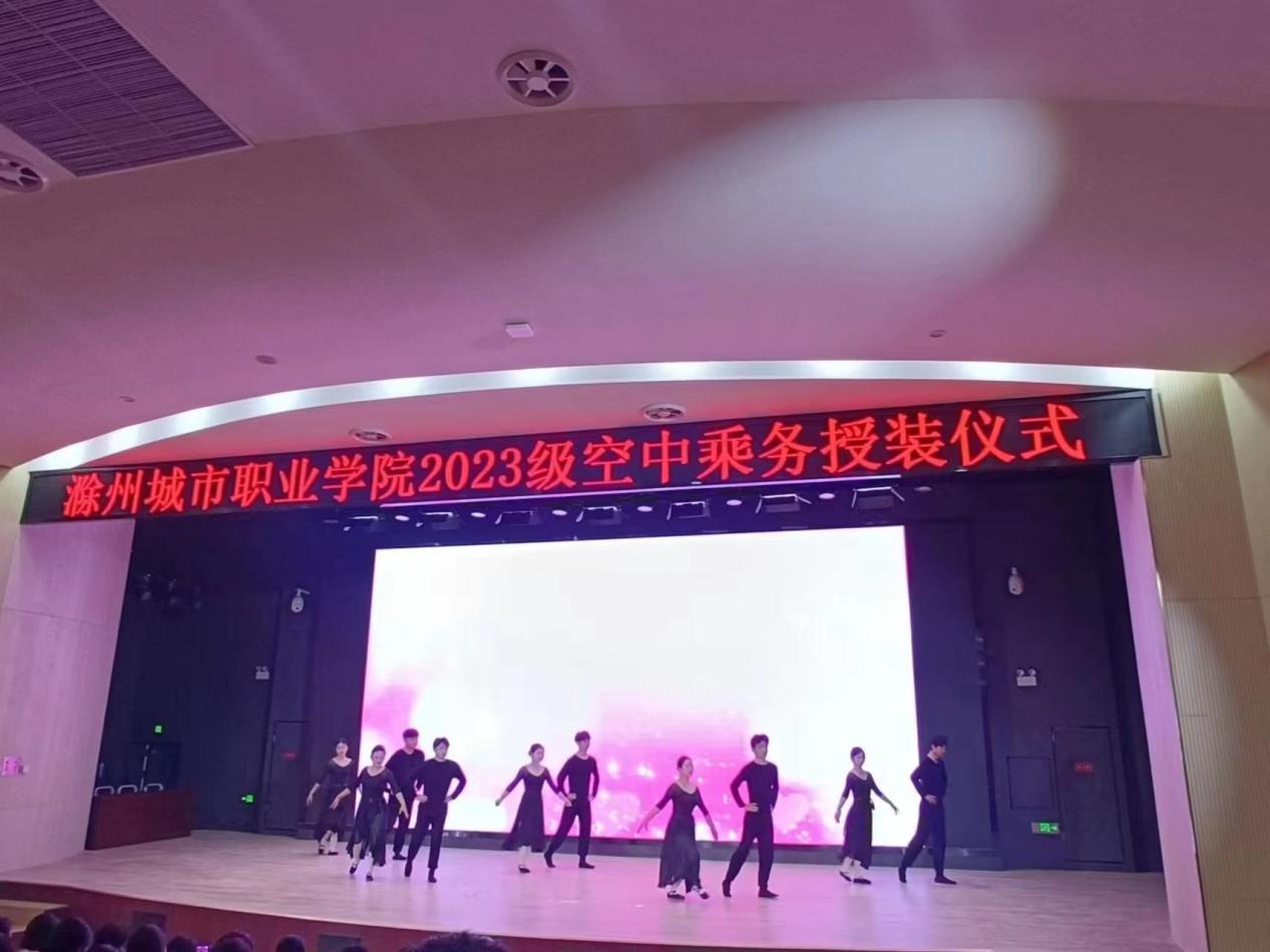 授装仪式在嘹亮的国歌声中拉开帷幕。滁州城市职业学院党委委员施向阳致辞。施向阳对2023级空中乘务专业同学的精神面貌、专业知识给予了高度的肯定,鼓励同学们守护制服荣誉感,并勉励同学们要有忠诚担当的政治品格、严谨科学的专业精神、团结协作的工作作风和敬业奉献的职业操守。“在大学时光里用积极的行动去努力拼搏,在‘民航强国’的战略背景下为未来民航事业的发展贡献自己的青春与智慧。”