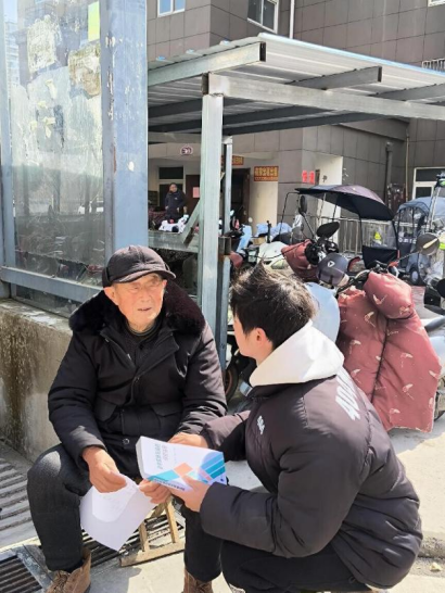图为张新盟同学向老人普及高血压知识