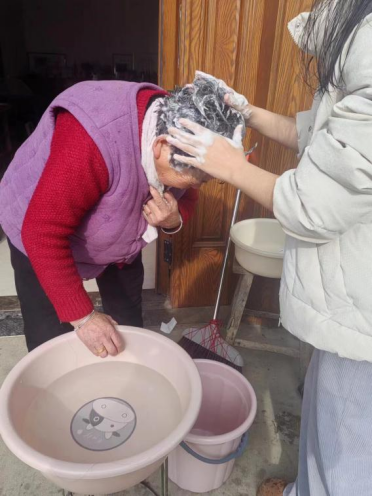 图为董晶晶为高龄老人洗头