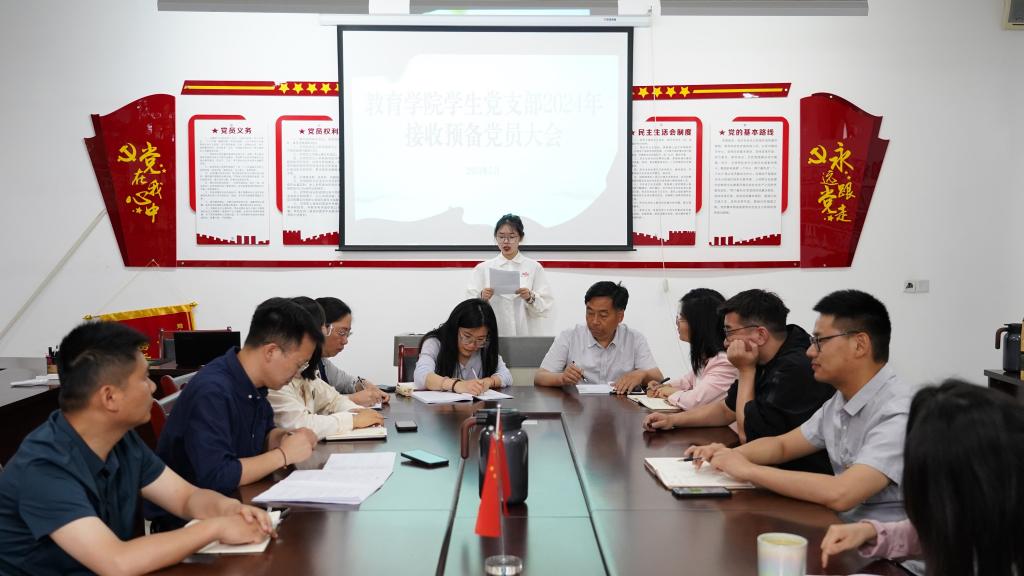 为进一步加强支部党组织建设,推进支部党员发展工作,教育学院学生党支部于5月31日在恩镇楼411会议室召开了接收预备党员大会,会议讨论了吸收葛锐等5名发展对象为支部预备党员的事宜。会议由学生党支部副书记杨维懂主持,支部全体党员、入党介绍人参加了此次会议。