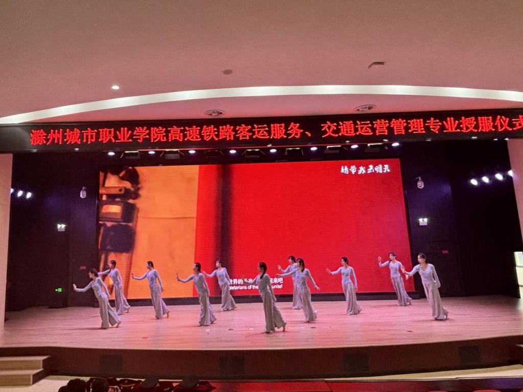 发言结束后,授服环节正式开始。领导嘉宾依次走上台,为高速铁路客运服务专业和交通运营管理专业的同学们逐一颁发制服。这一庄重仪式意味着同学们正式踏上了专业学习的征途,成为了一名准城轨行业人,肩负起了行业使命。23级高速铁路客运服务专业的陈玉轩同学唱响歌曲《奔跑》,用歌声唱出追逐梦想的坚定信念。