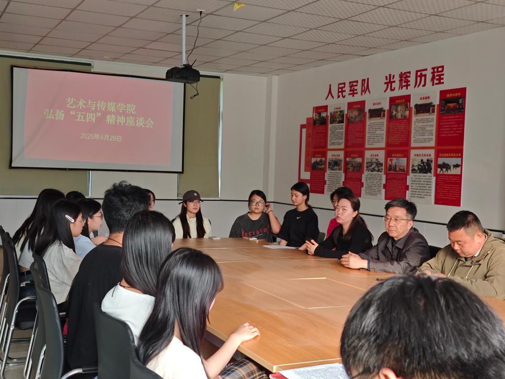 为迎接五四青年节到来,聆听青年心声、凝聚奋进力量,4月29日下午,在学校一站式学生社区服务中心,艺术与传媒学院举办弘扬五四精神座谈会。艺术与传媒学院学生会干部代表、青年学生代表、班级心理委员代表参加了会议,会议由学院团总支书记周桐羽主持。艺术与传媒学院党总支书记杨孝富、学管秘书李巍老师出席会议。