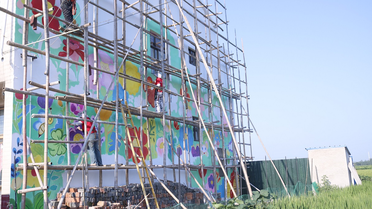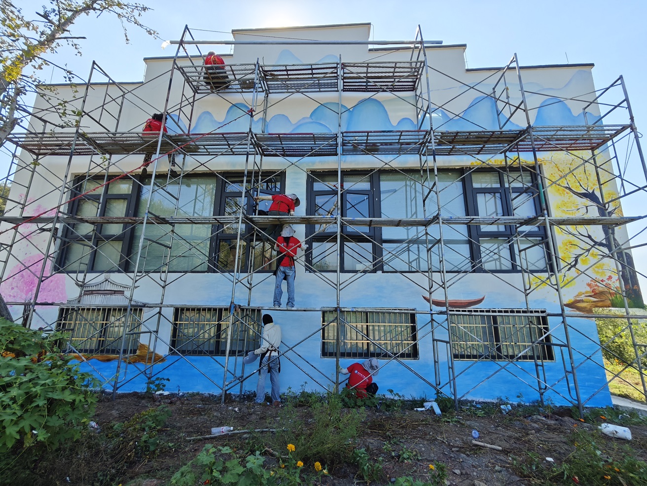 实践期间,队员们面临着高温酷暑和高空作业的双重考验。自8月11日起,他们先后在天长市连续创作5天,在来安县奋战5天,并于8月25日至27日完成在明光市3天的绘制任务。尽管烈日当头、汗流浃背,但队员们热情不减,分工协作,调色、勾勒、填充,一丝不苟。脚手架上是他们忙碌的身影,墙壁前是他们专注的神情。他们以极高的热情和专业精神,克服困难,最终高质量地完成了所有预定墙绘任务,将一面面旧墙变身成为一幅幅生动鲜活、富有教育意义和地方特色的艺术画作。