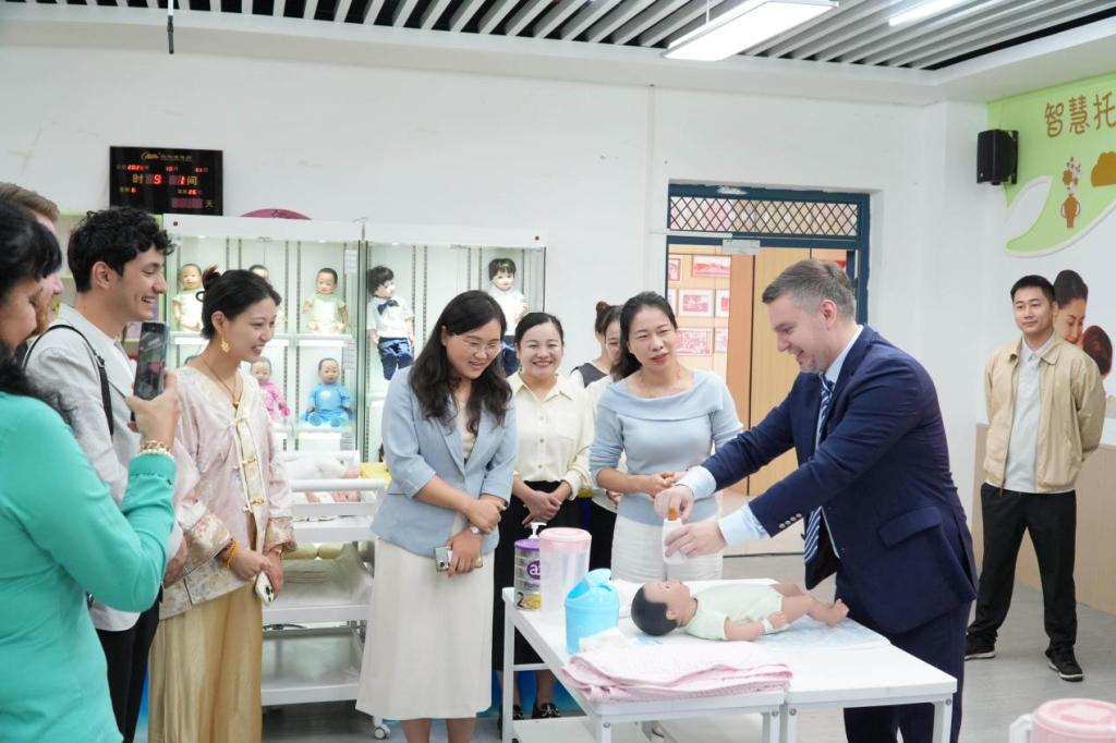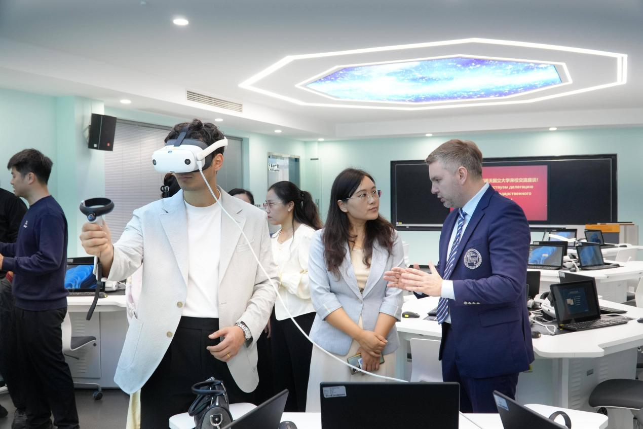 10月11日,俄罗斯伊万诺沃国立大学校长马雷金·阿列克谢·亚历山德罗维奇、副校长索罗金·尼基塔·德米特里耶维奇一行来我院学前教育虚拟仿真实训基地参观交流,就婴幼儿照护专业实训教学、虚拟资源建设开展交流。校党委委员、副校长孙静,教育学院副院长袁远等陪同参观。